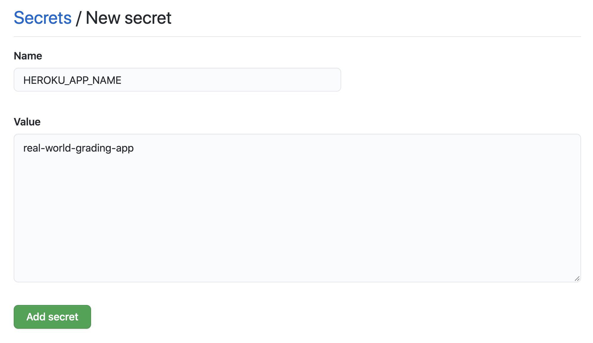 Click on New secret, use the name field for the secret name, e.g., HEROKU_APP_NAME and set the value: