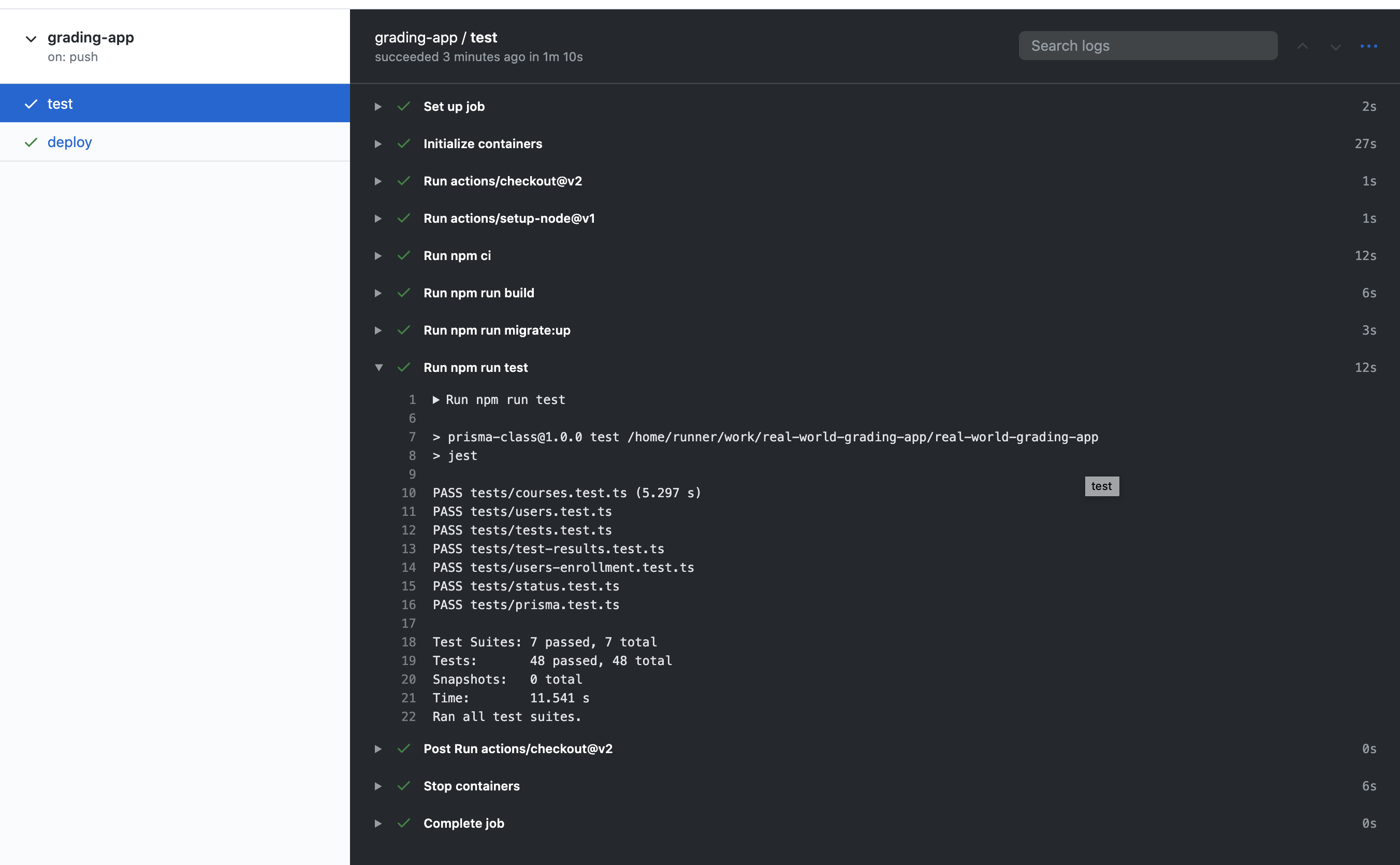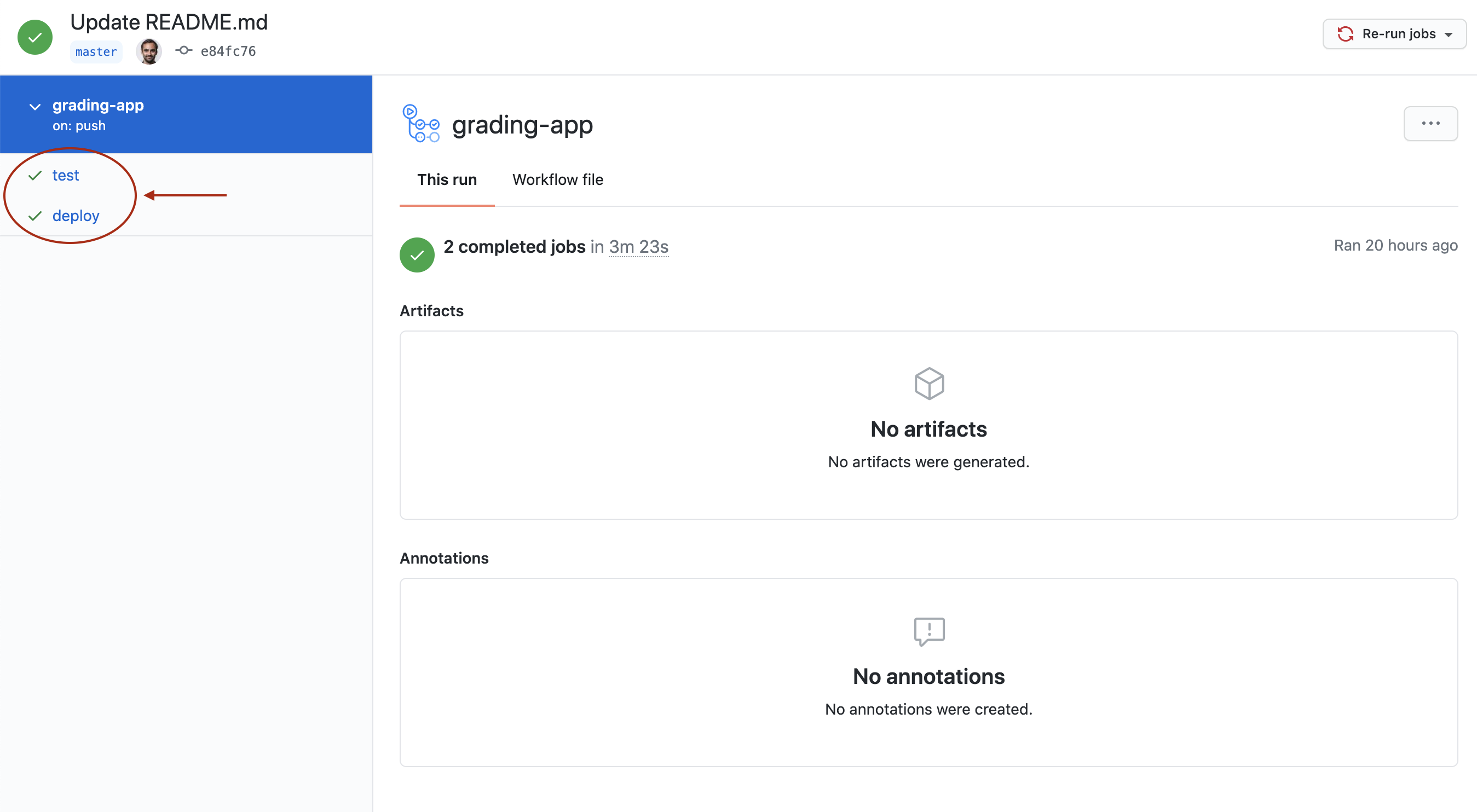 heroku_email: ${{ secrets.HEROKU_EMAIL }}The grading-app workflow has two jobs: test and deploy.