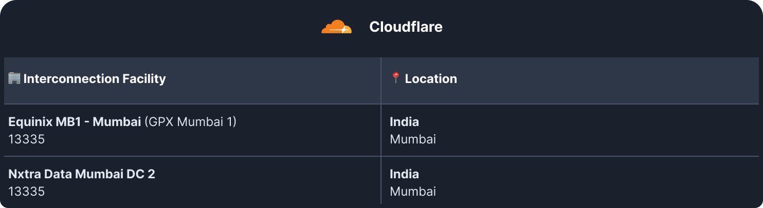 The Cloudflare BOM (Mumbai) PoP is also peering the Equinix MB1 facility, so the network distance between the Cloudflare and AWS facilities in Mumbai is very short: