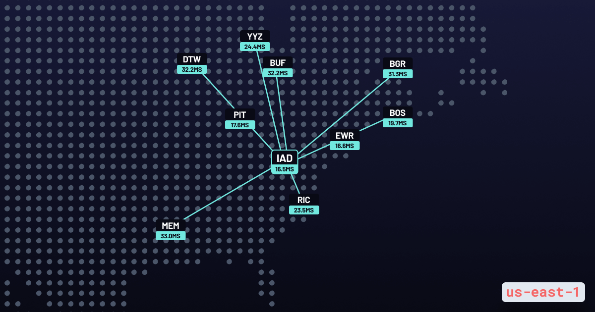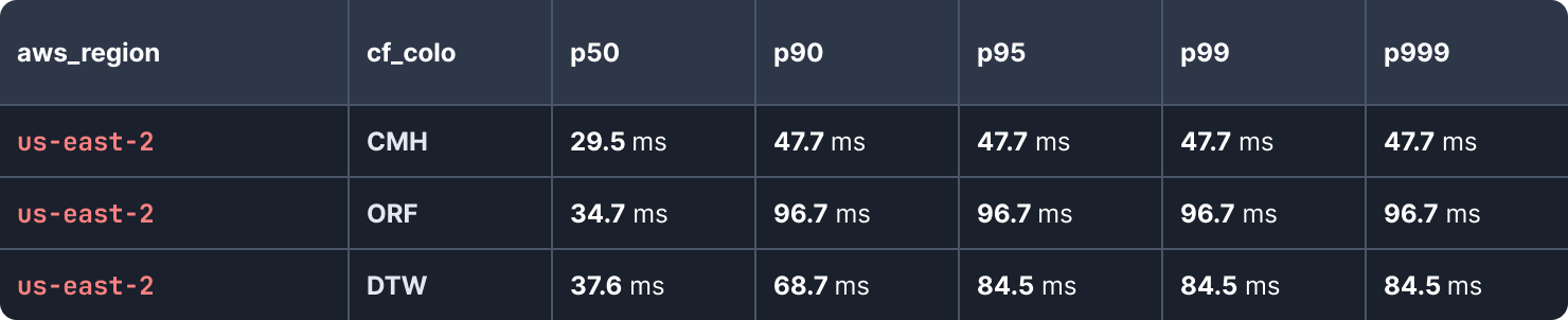 Contrast this with the us-east-2 AWS region in Columbus, Ohio which has a p50 that is almost three times as high to the nearest Cloudflare PoP CMH, which is also in Columbus: