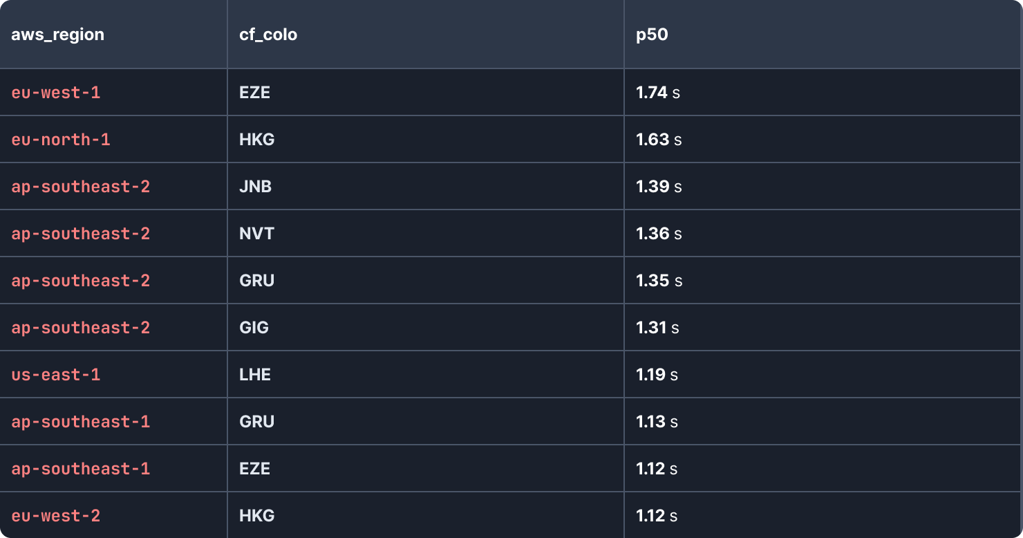 Prisma Accelerate is a global database cache, increasing the performance of websites that are deployed in multiple regions and communicating with a central database. As such, we see traffic from almost all Cloudflare PoPs to any given AWS region. These are the AWS region and Cloudflare PoP pairs where we observe the highest latency: