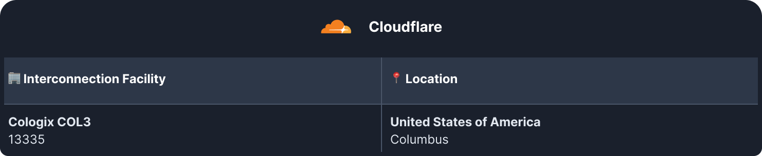 Cloudflare also has a PoP in Columbus, but it is peering at a different Cologix facility, resulting in additional network hops: