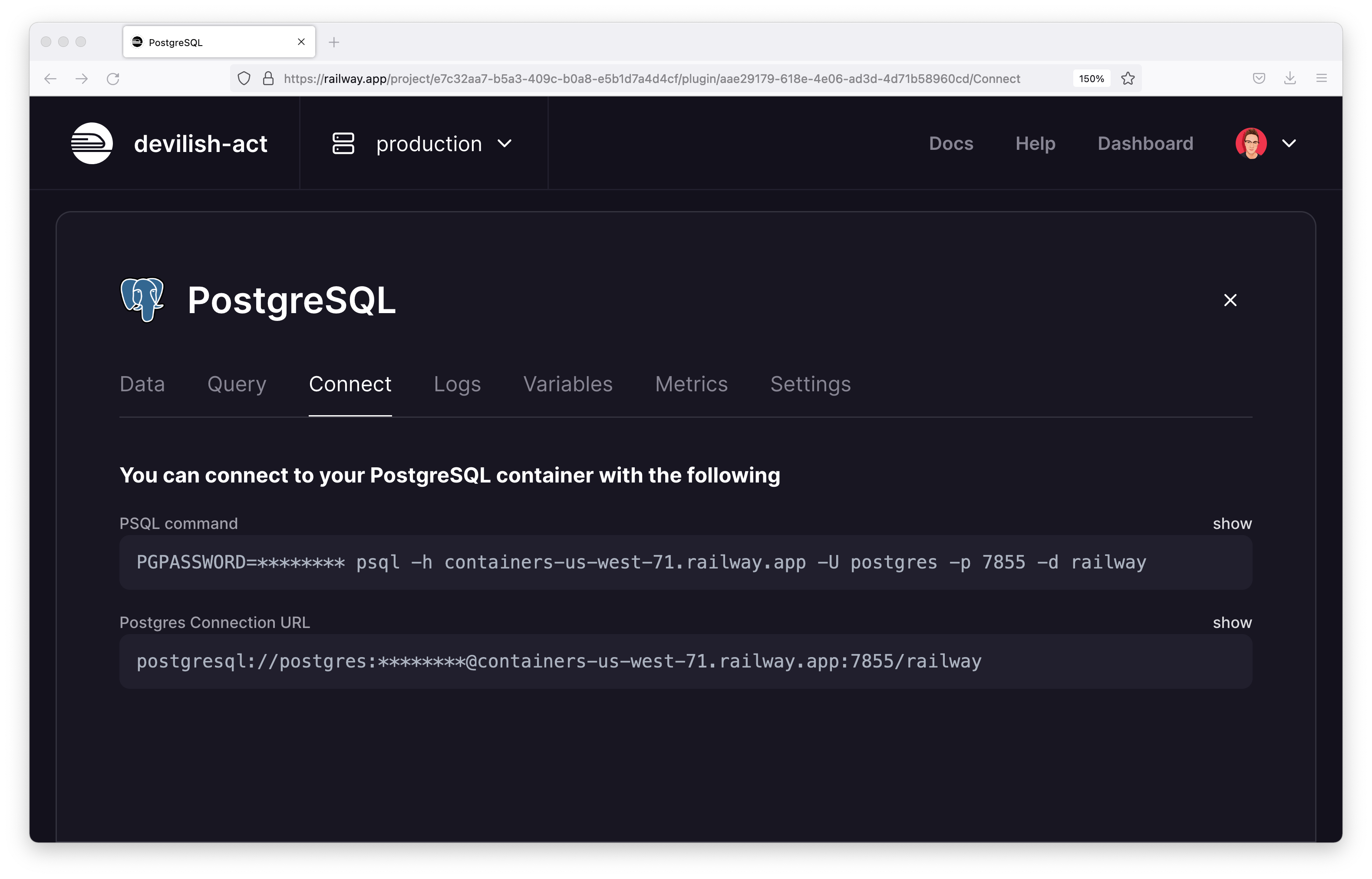 variable named DATABASE_URL to find the database's connection string.