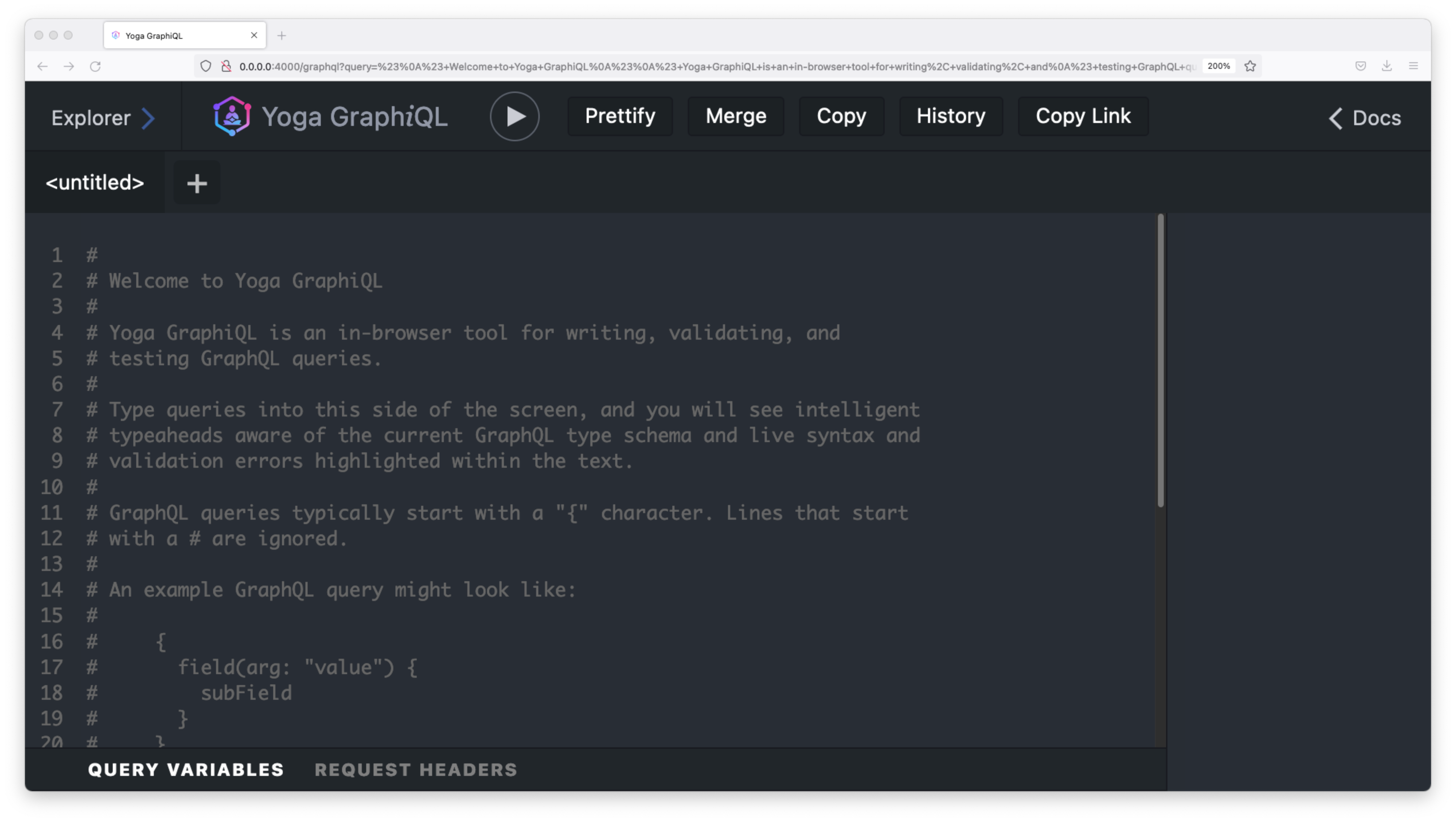 npm run devAfter running the above command, open up http://localhost/graphql in your browser to access the GraphQL playground. You should be presented with a page that looks like this: