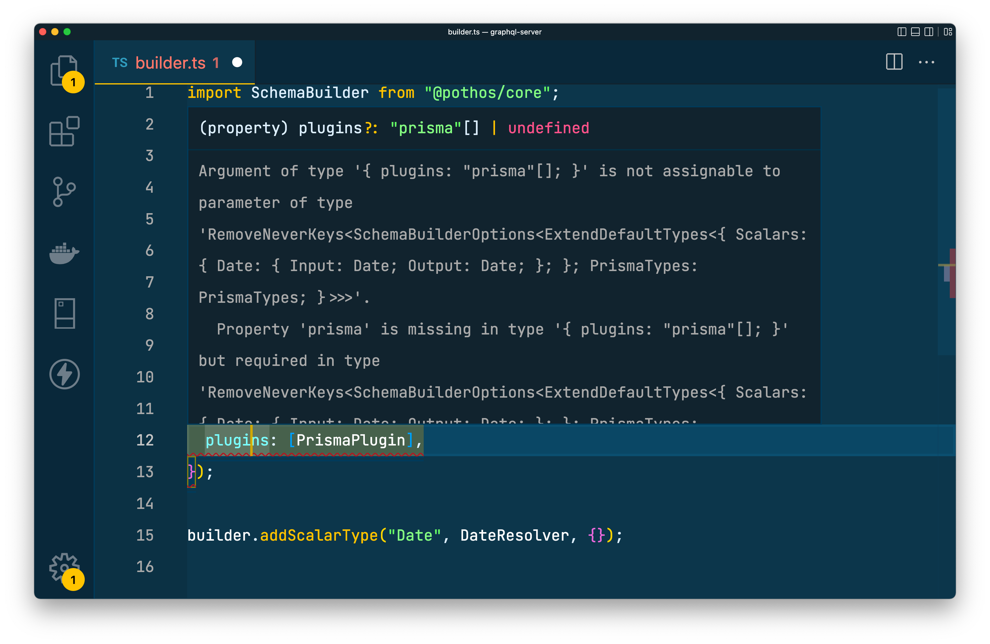 npm i graphql-scalarsYou will need to register a Date scalar with your schema builder to let it know how to handle dates. The schema builder takes in a generic where you can specify various configurations.