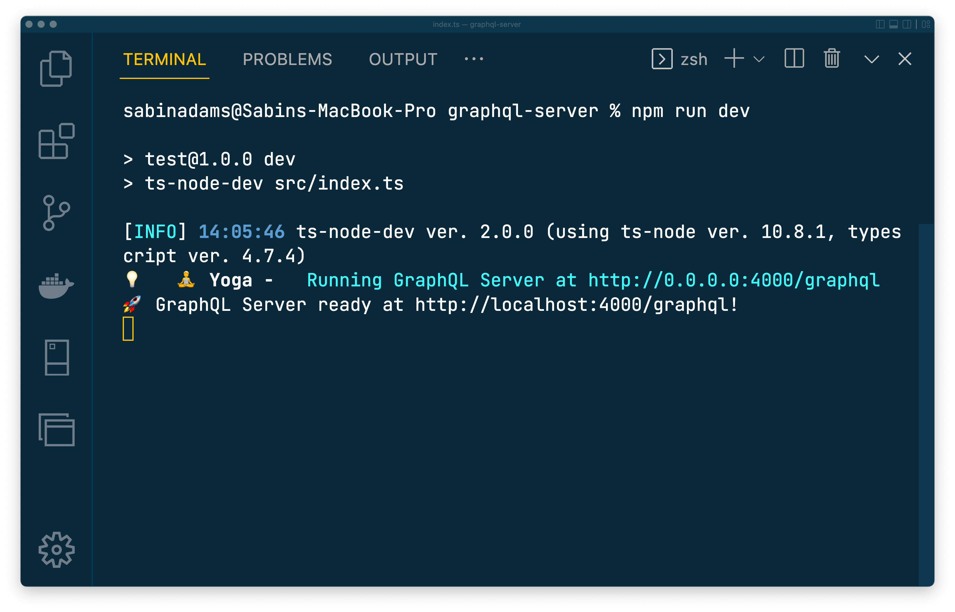 npm install @graphql-yoga/node graphqlWith those packages installed, you can now start up your own GraphQL server. Head over to src/index.ts. Replace the existing contents with the this snippet: