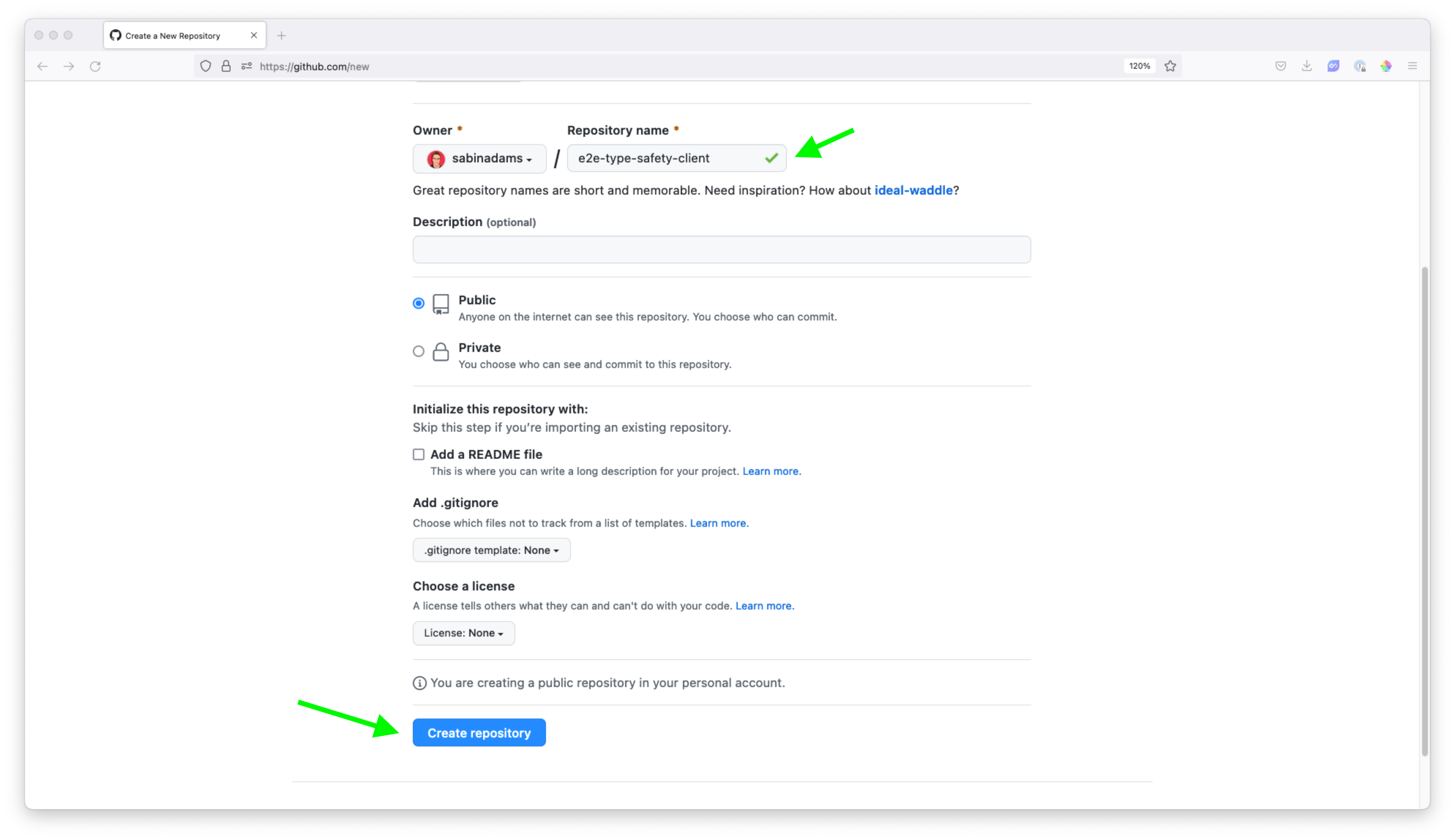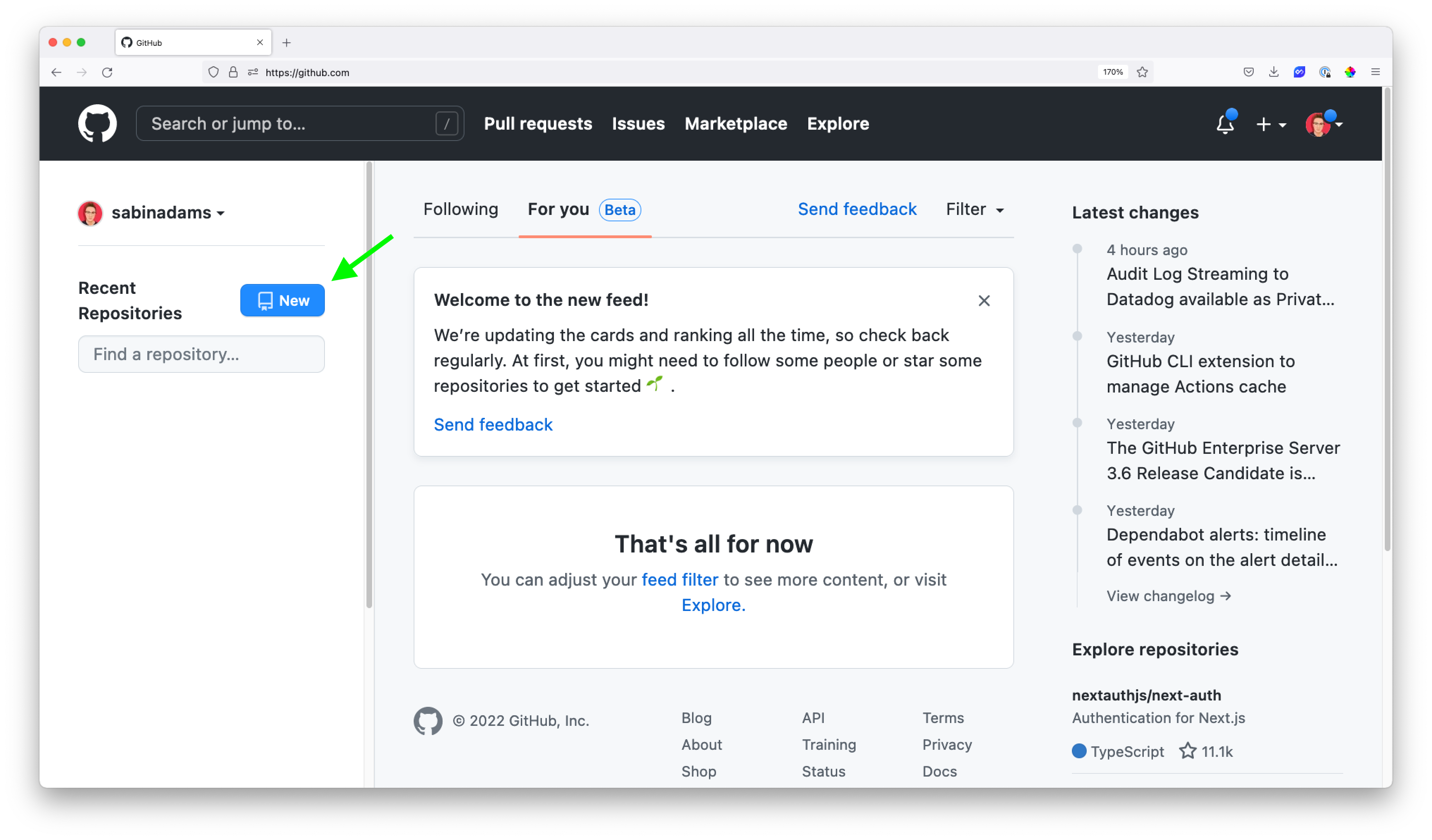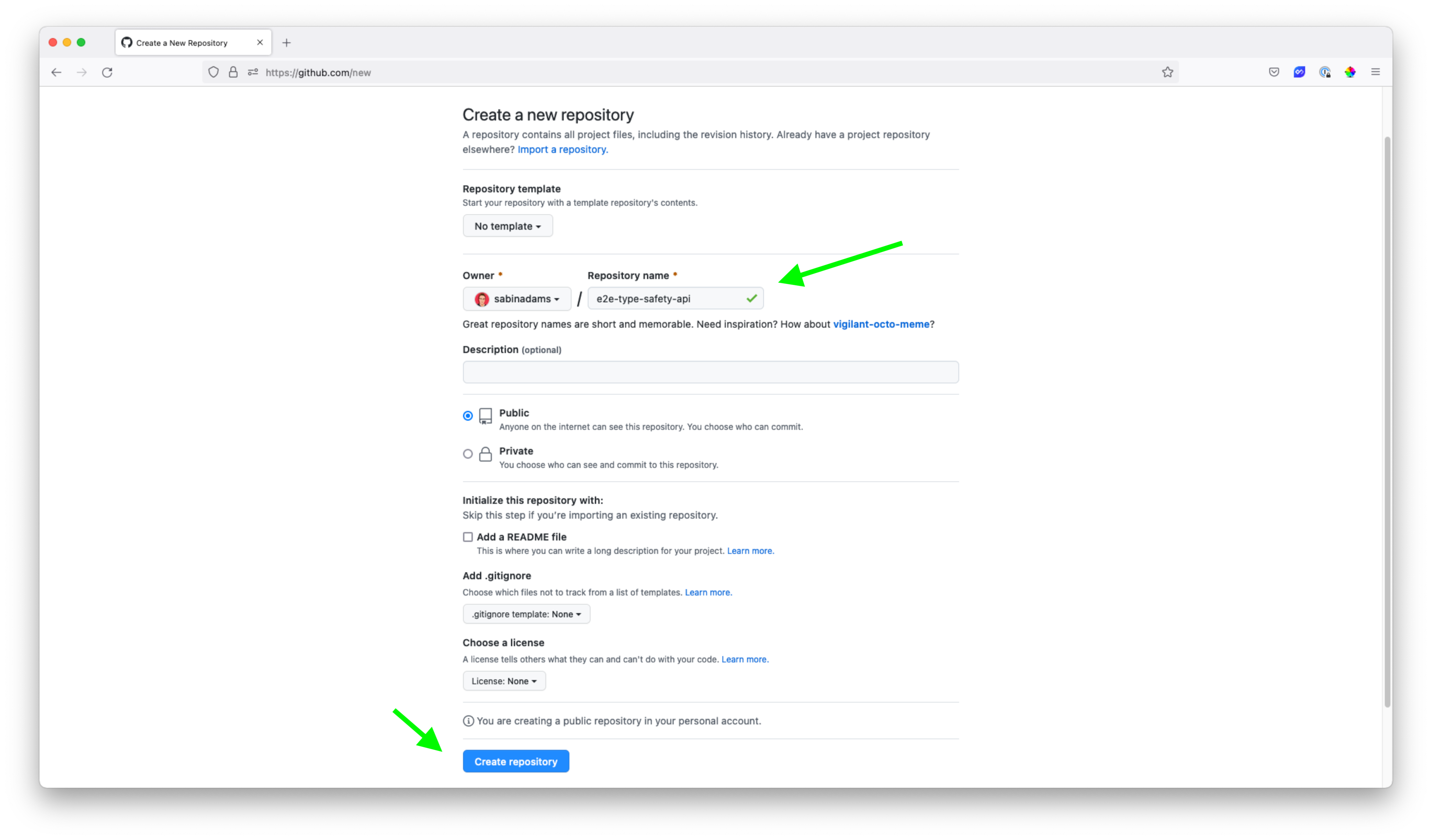 git push -u origin mainNext, you will repeat these steps for your API's codebase. Create another new repository from your Github dashboard: