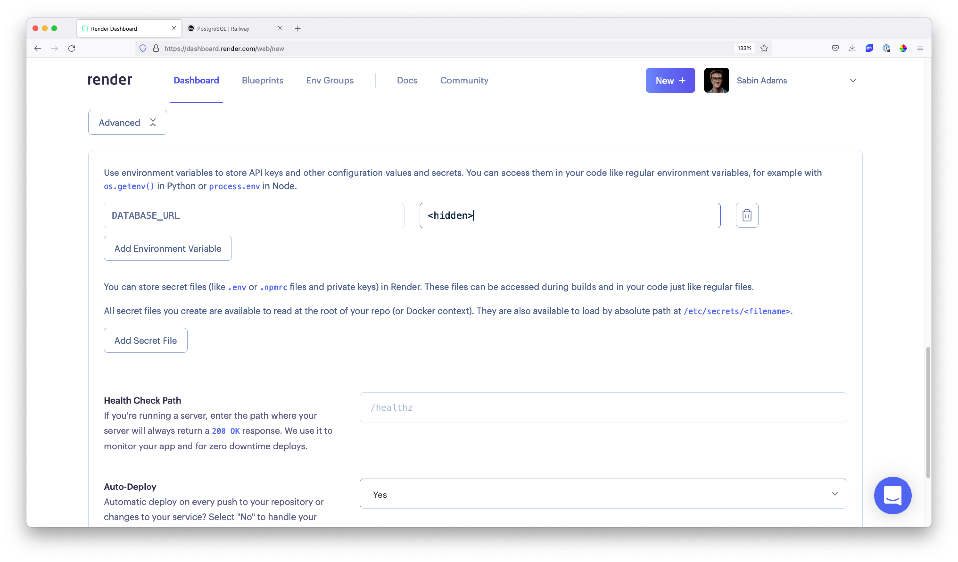 Click the Add Environment Variable button and add a variable named DATABASE_URL whose value is the connection string to your Postgres database: