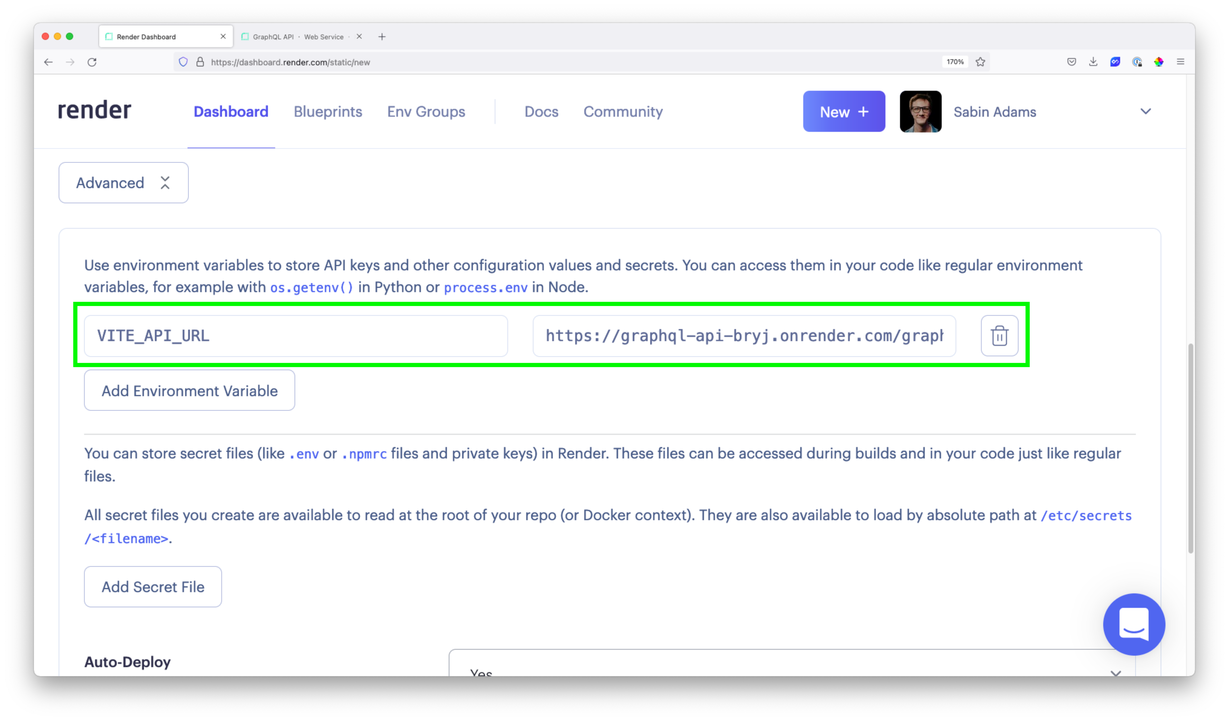 Under the Advanced section, add an environment variable named VITE_API_URL whose value is the URL of your deployed GraphQL API at the /graphql route. For example: