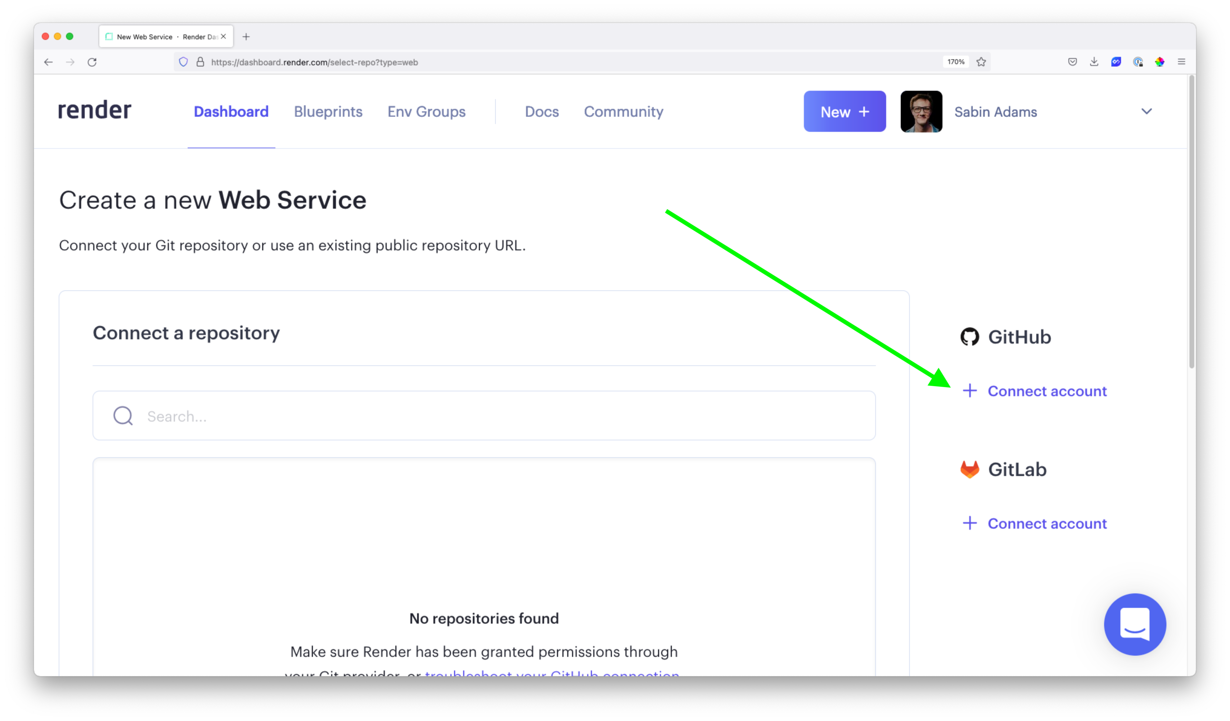 On this page, if you haven't already, click + Connect account under the Github header to give Render access to list your Github repositories: