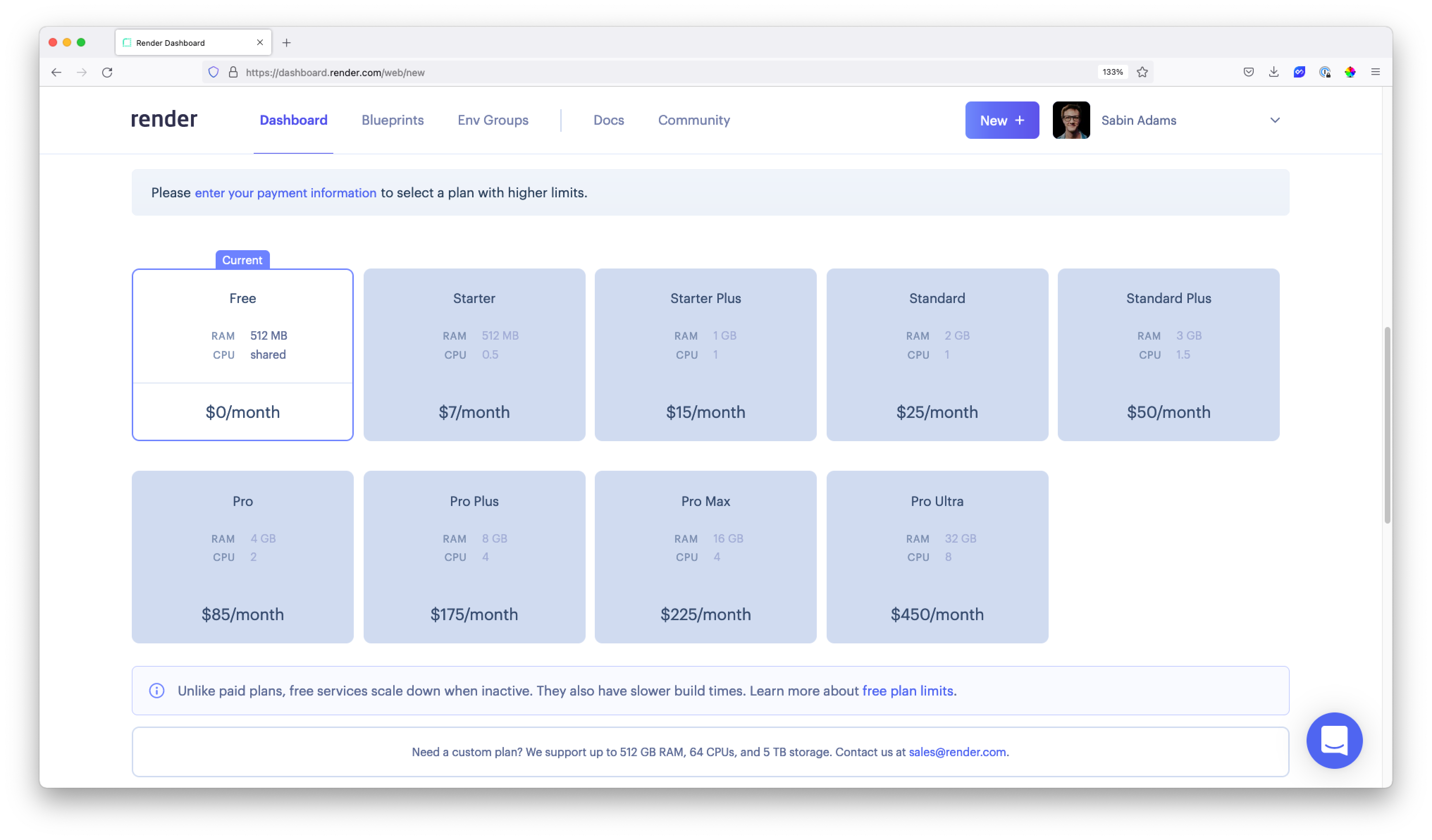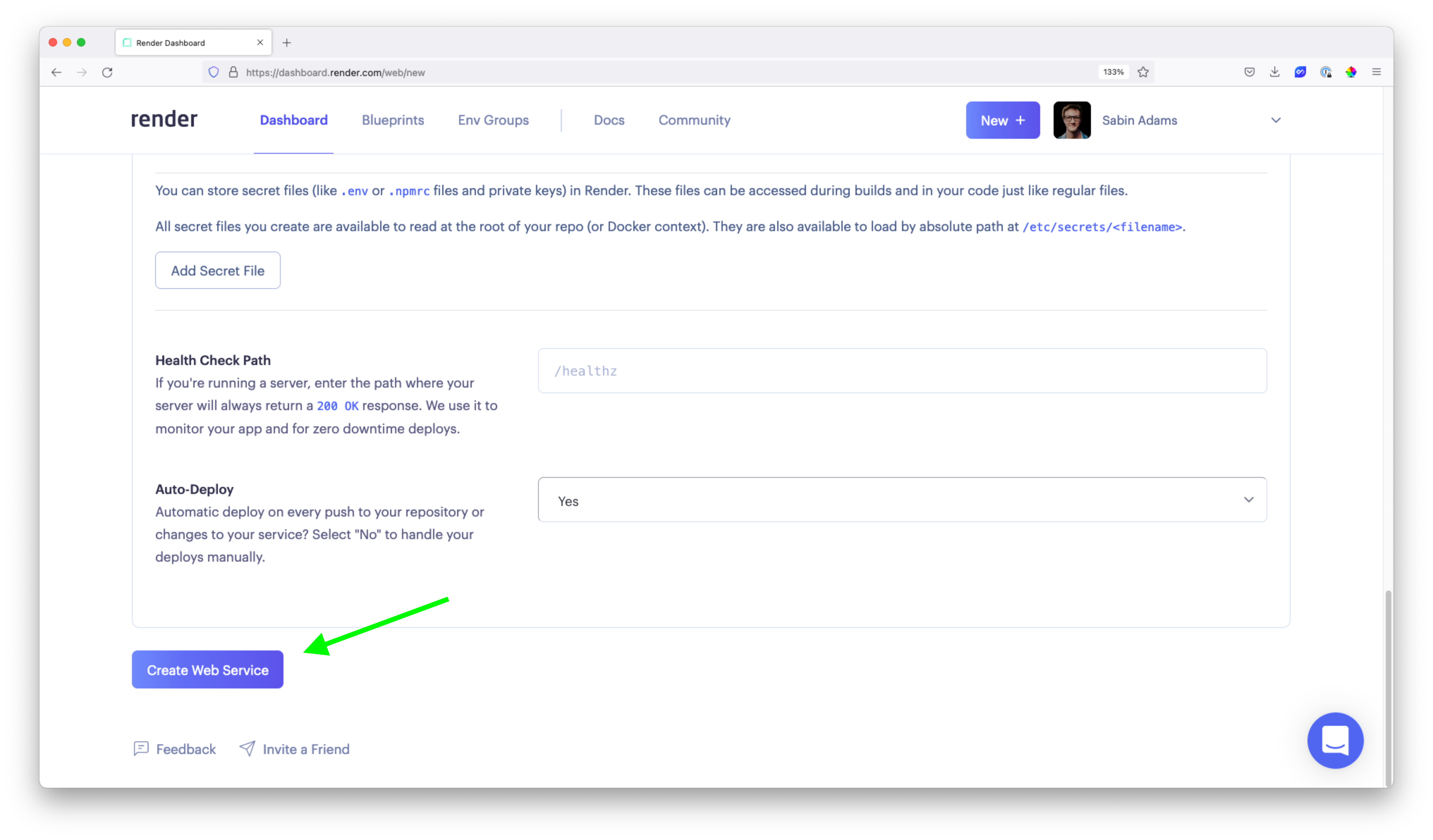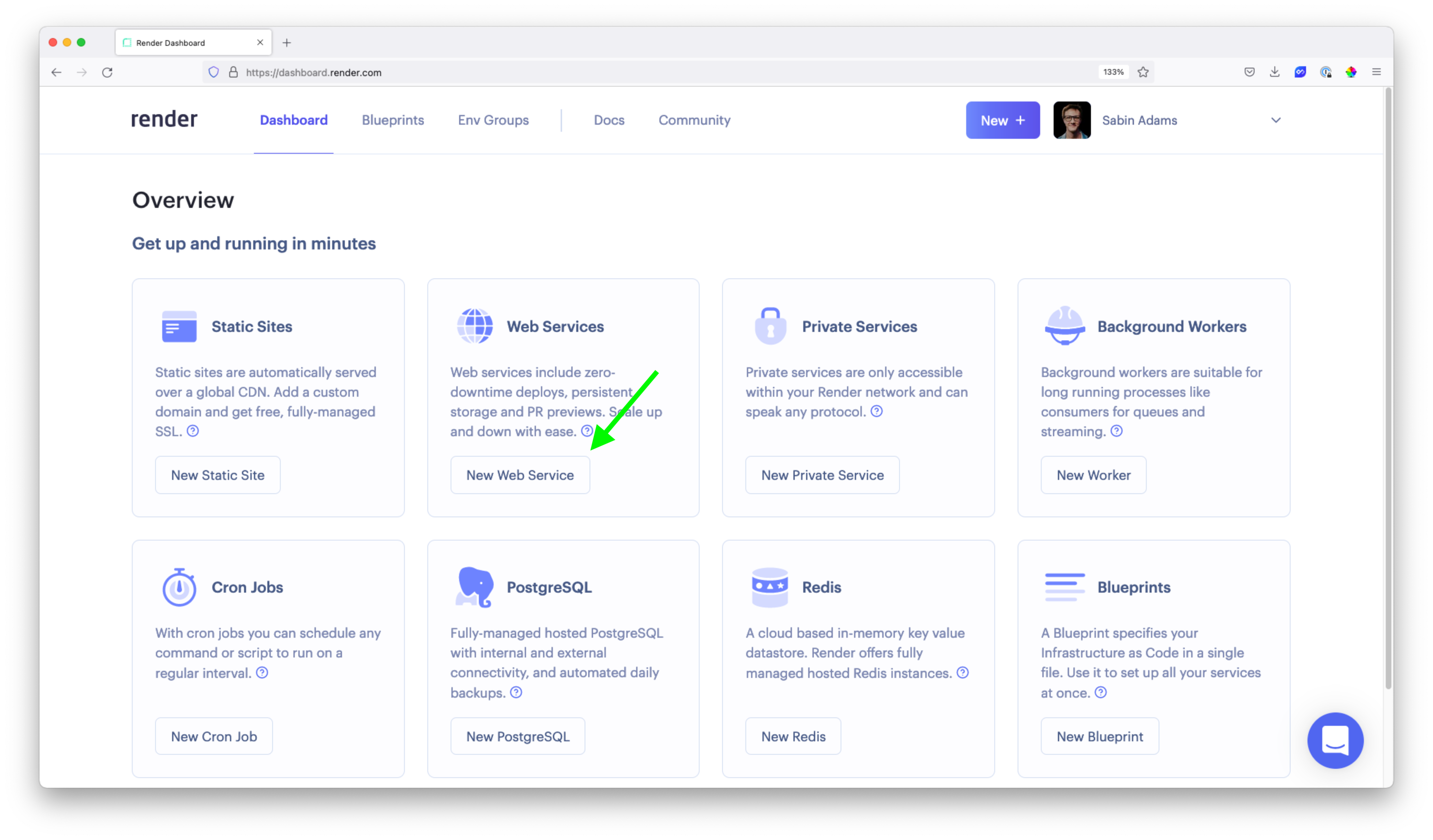 The first thing you will deploy is your GraphQL API. On your dashboard, hit the New Web Service button, which will allow you to deploy a Node.js application: