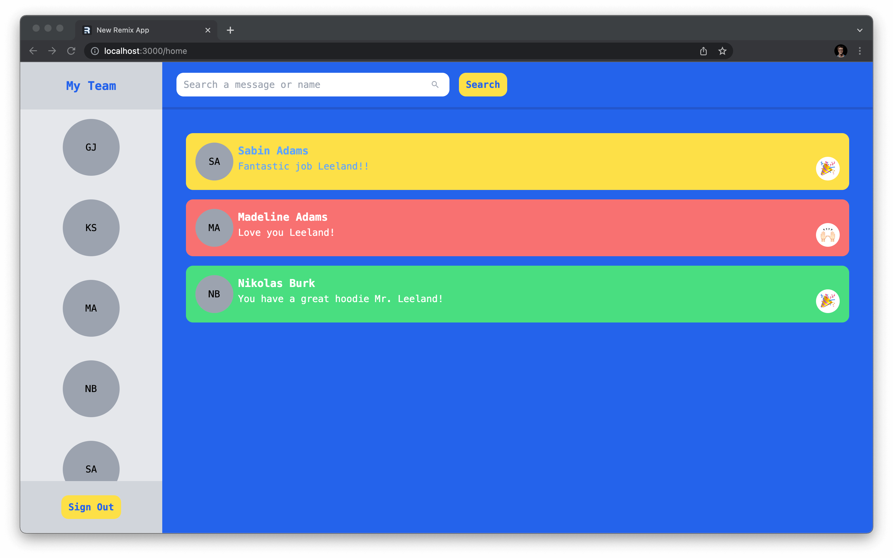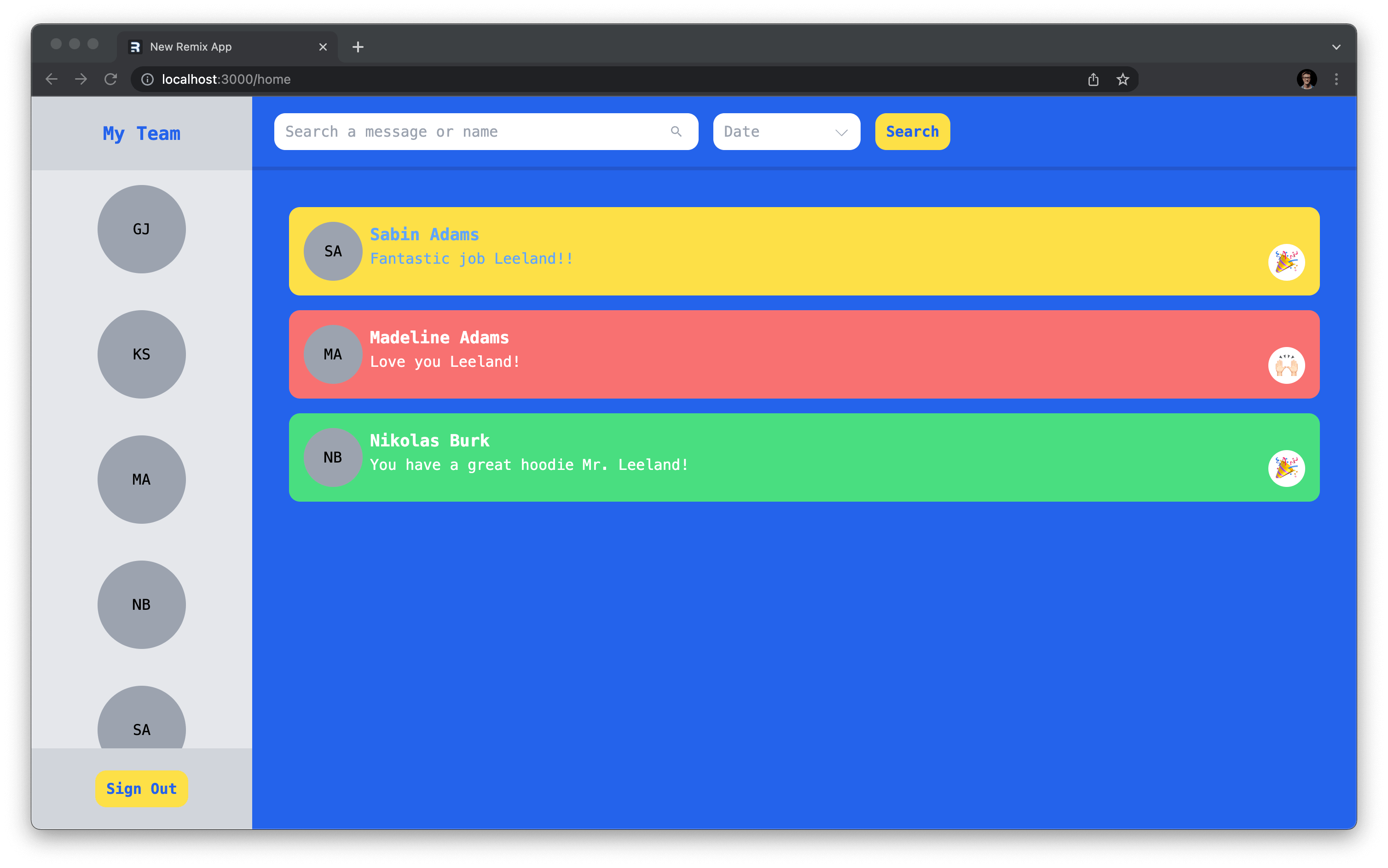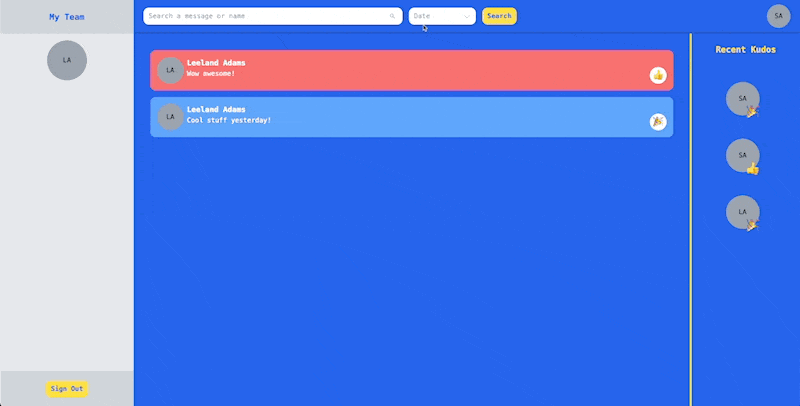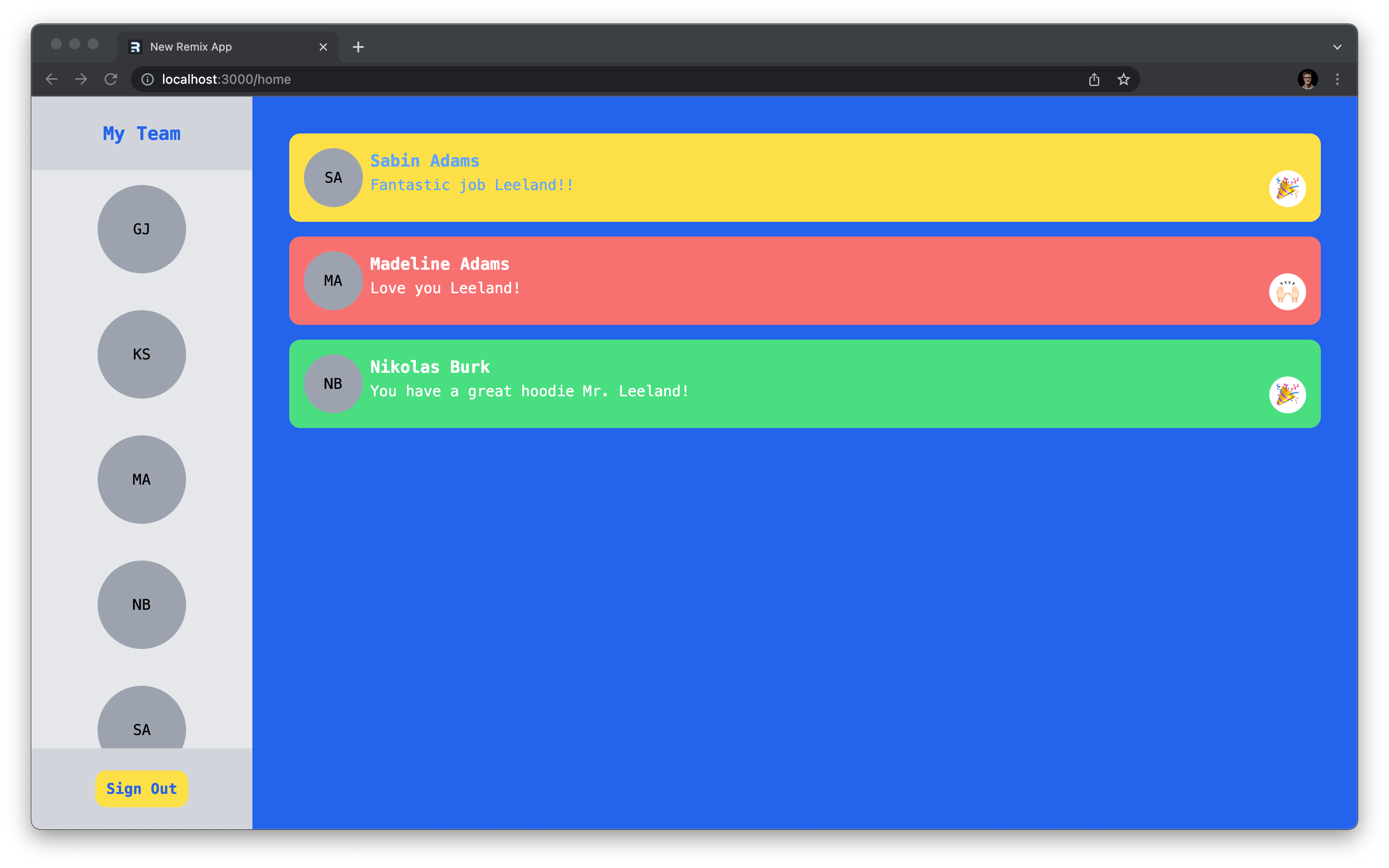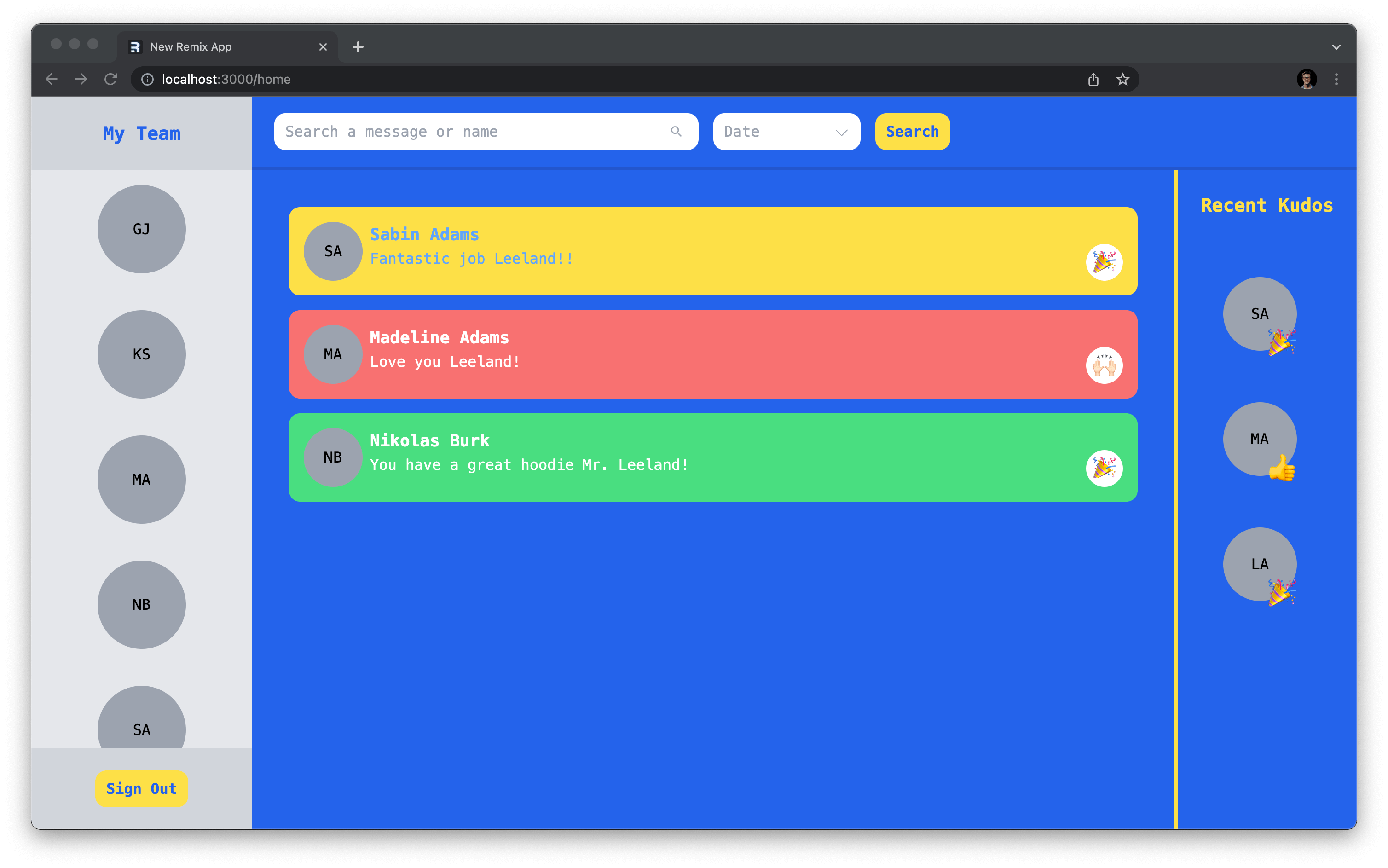 }With that, your home page is complete and you should see a list of the three most recent kudos sent in your application!