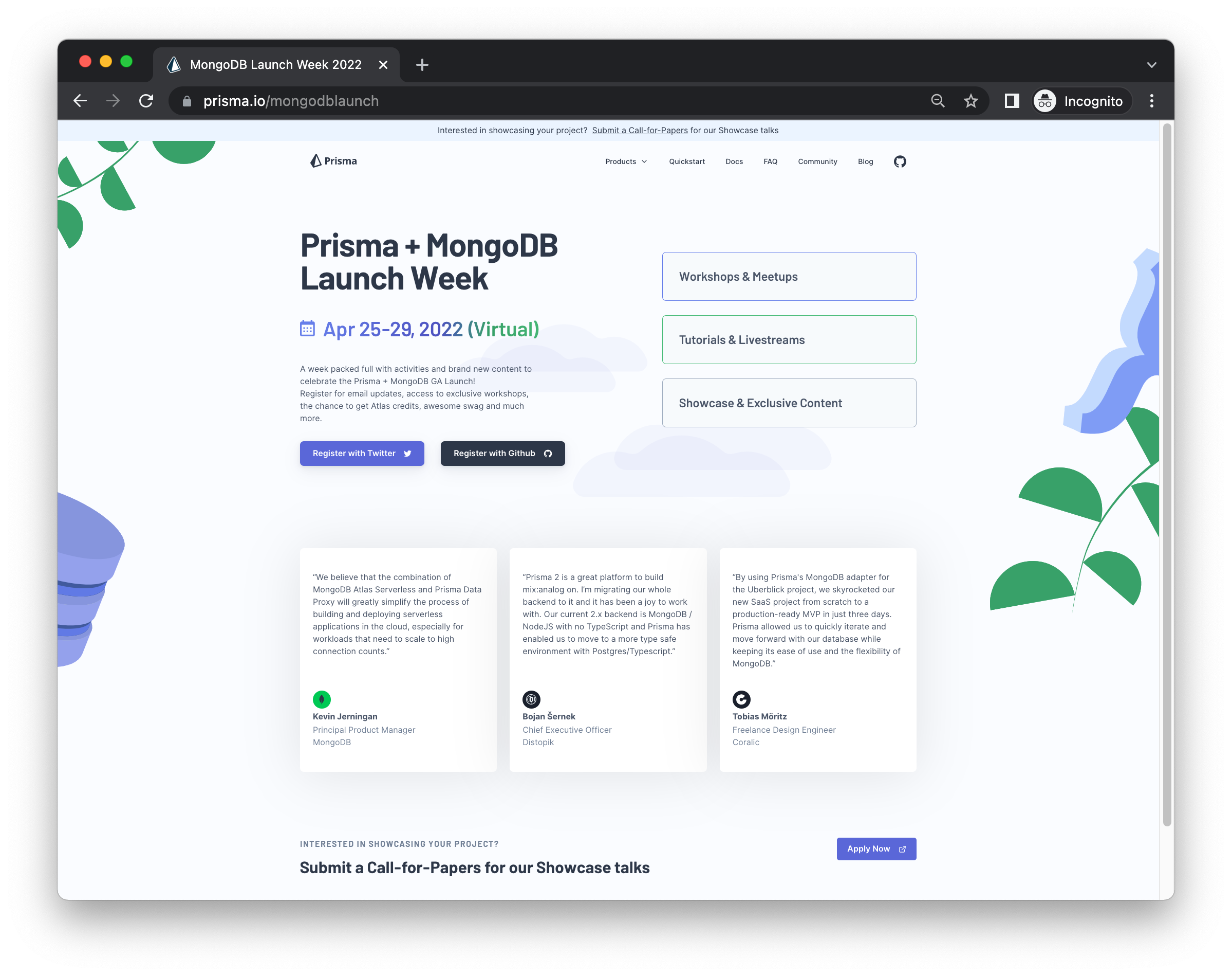Sign up via the website above to join us for the launch week! You can also submit a talk proposal for our Showcase Lightning Talks (~3min) if you are building something with MongoDB and Prisma and want to talk about it during the launch week!