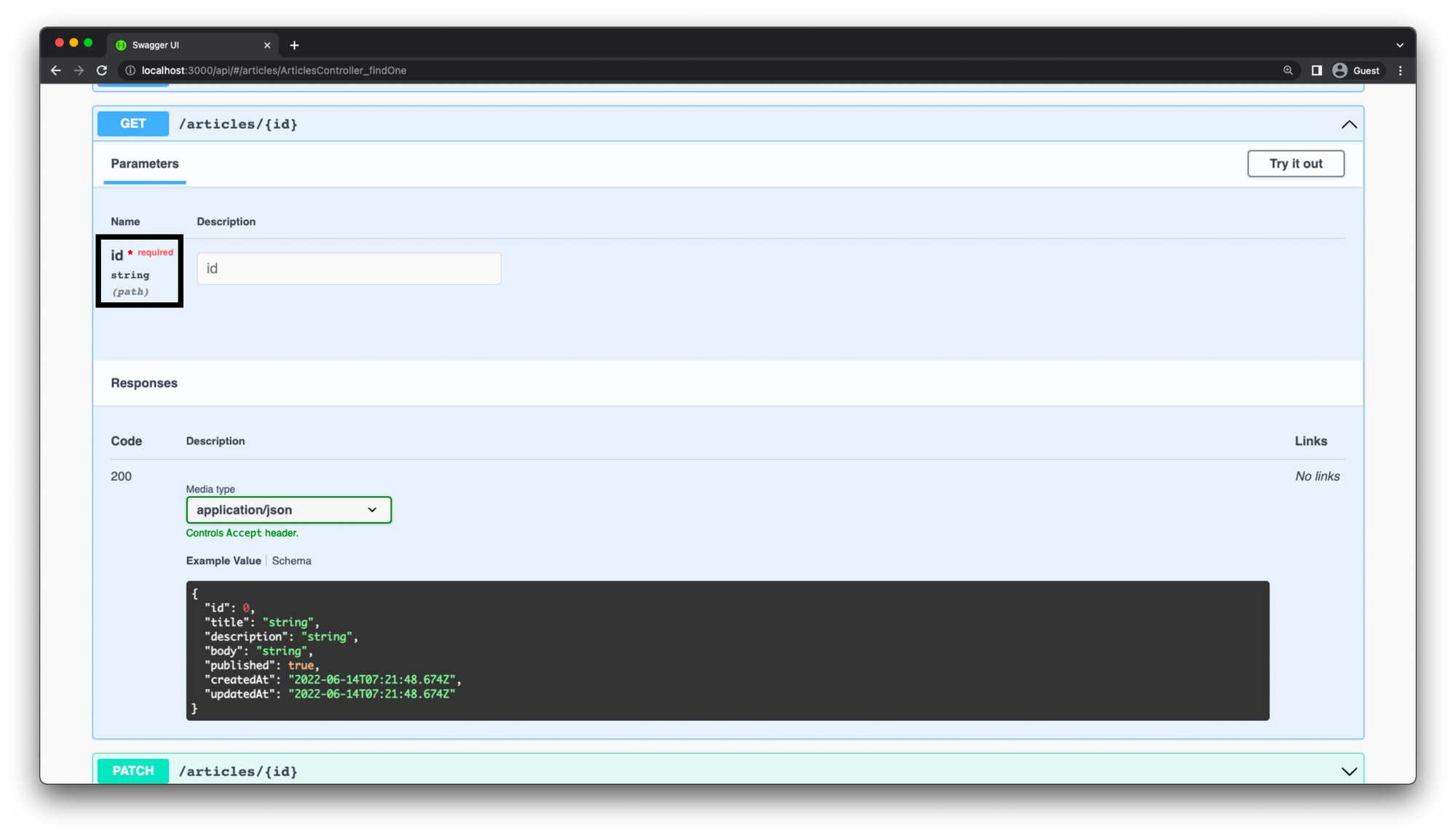 Inside your API, you are currently accepting the id parameter for the GET /articles/{id} , PATCH /articles/{id} and DELETE /articles/{id} endpoints as a part of the path. NestJS parses the id parameter as a string from the URL path. Then, the string is cast to a number inside your application code before being passed to the ArticlesService. For example, take a look at the DELETE /articles/{id} route handler: