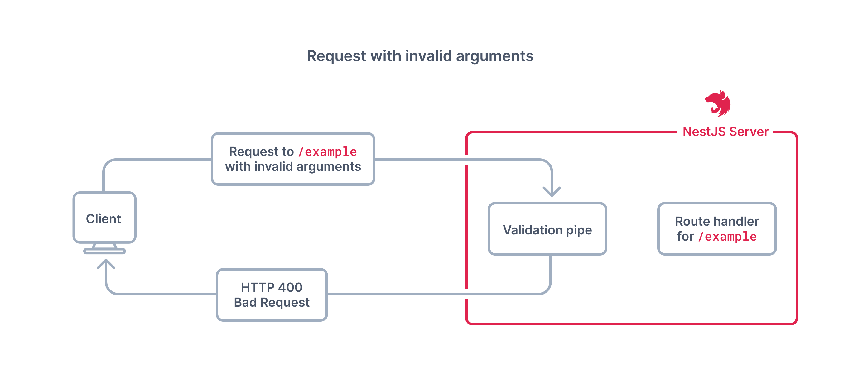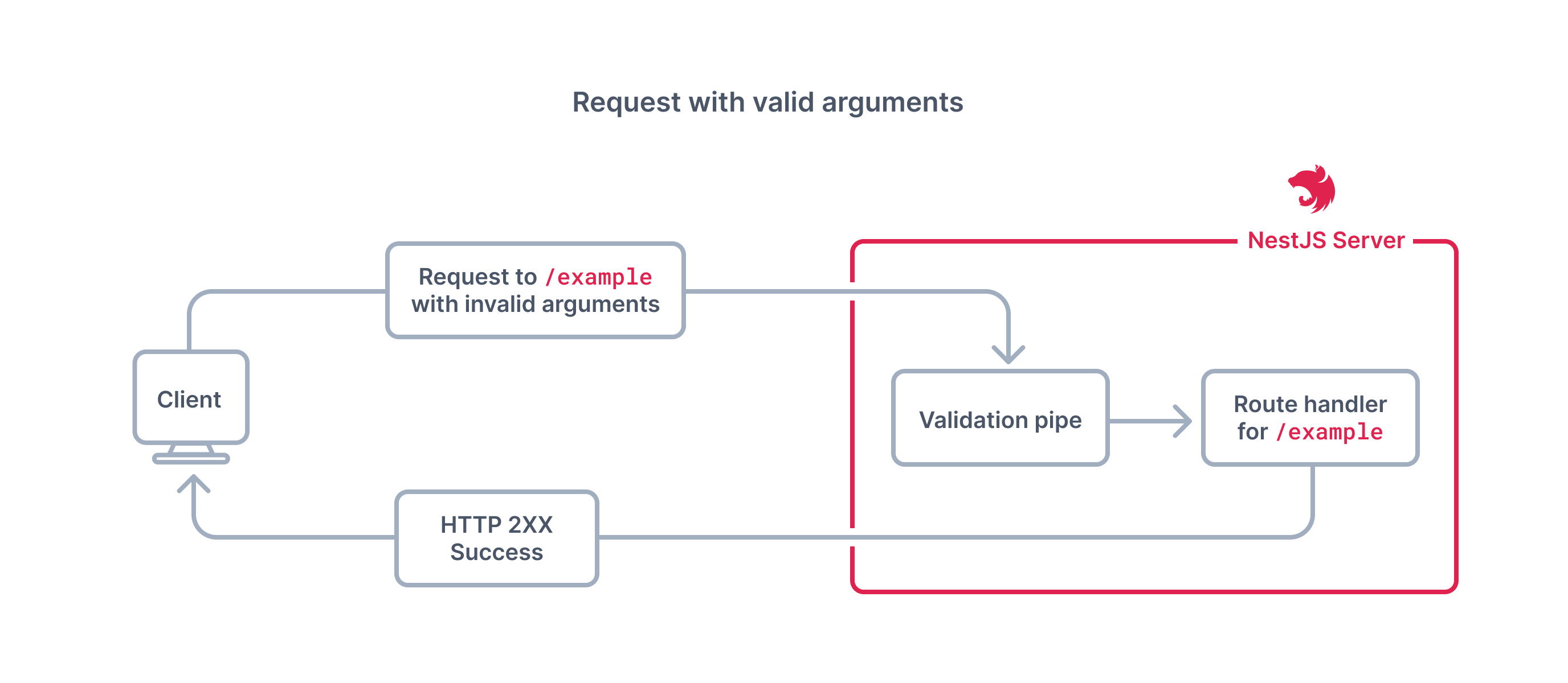 The following two diagrams shows how validation pipe works, for an arbitrary /example route.