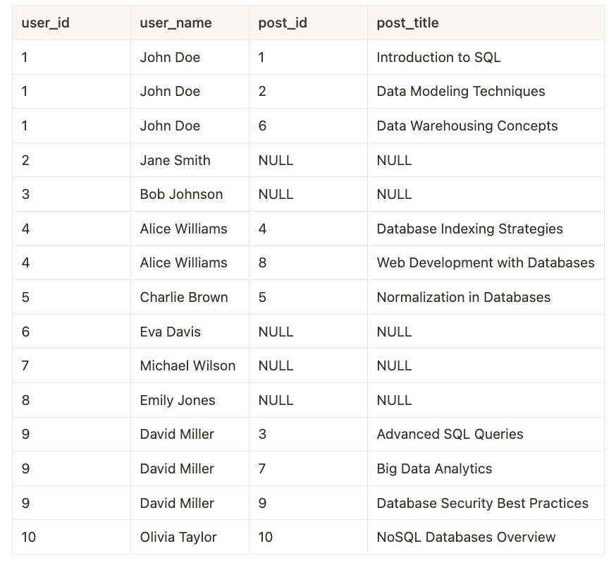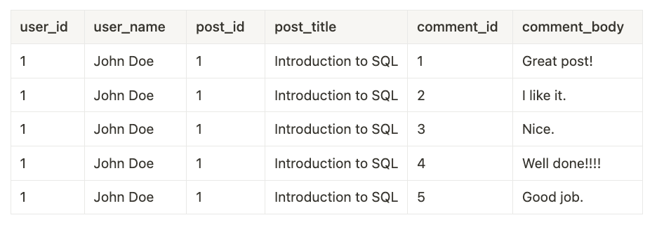 Notice the redundancy in the user_name column in this case. This redundancy is only going to get worse the more tables are being joined. For example, assume there's another Comment table, where each comment has a postId foreign key that points to a record in the Post table.