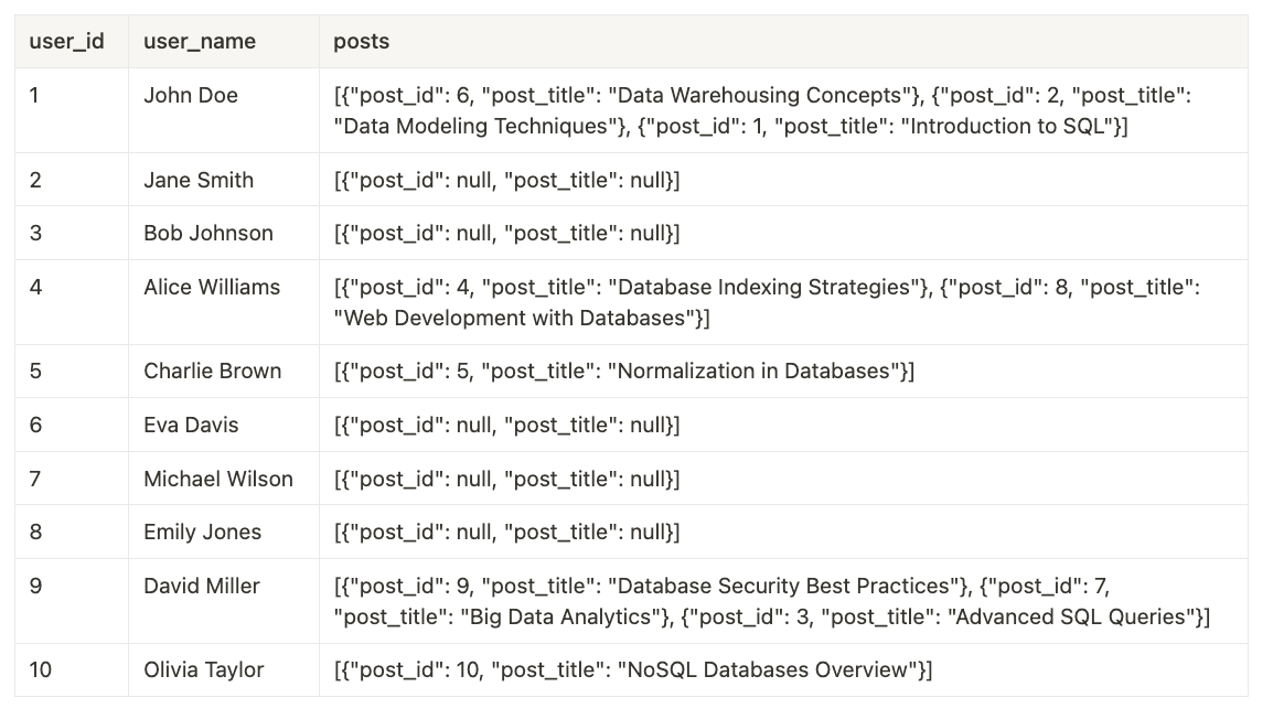 ALTER TABLE "Post" ADD CONSTRAINT "Post_authorId_fkey" FOREIGN KEY ("authorId") REFERENCES "User"("id") ON DELETE SET NULL ON UPDATE CASCADE;To retrieve all users with their posts, you can use a simple LEFT JOIN query: