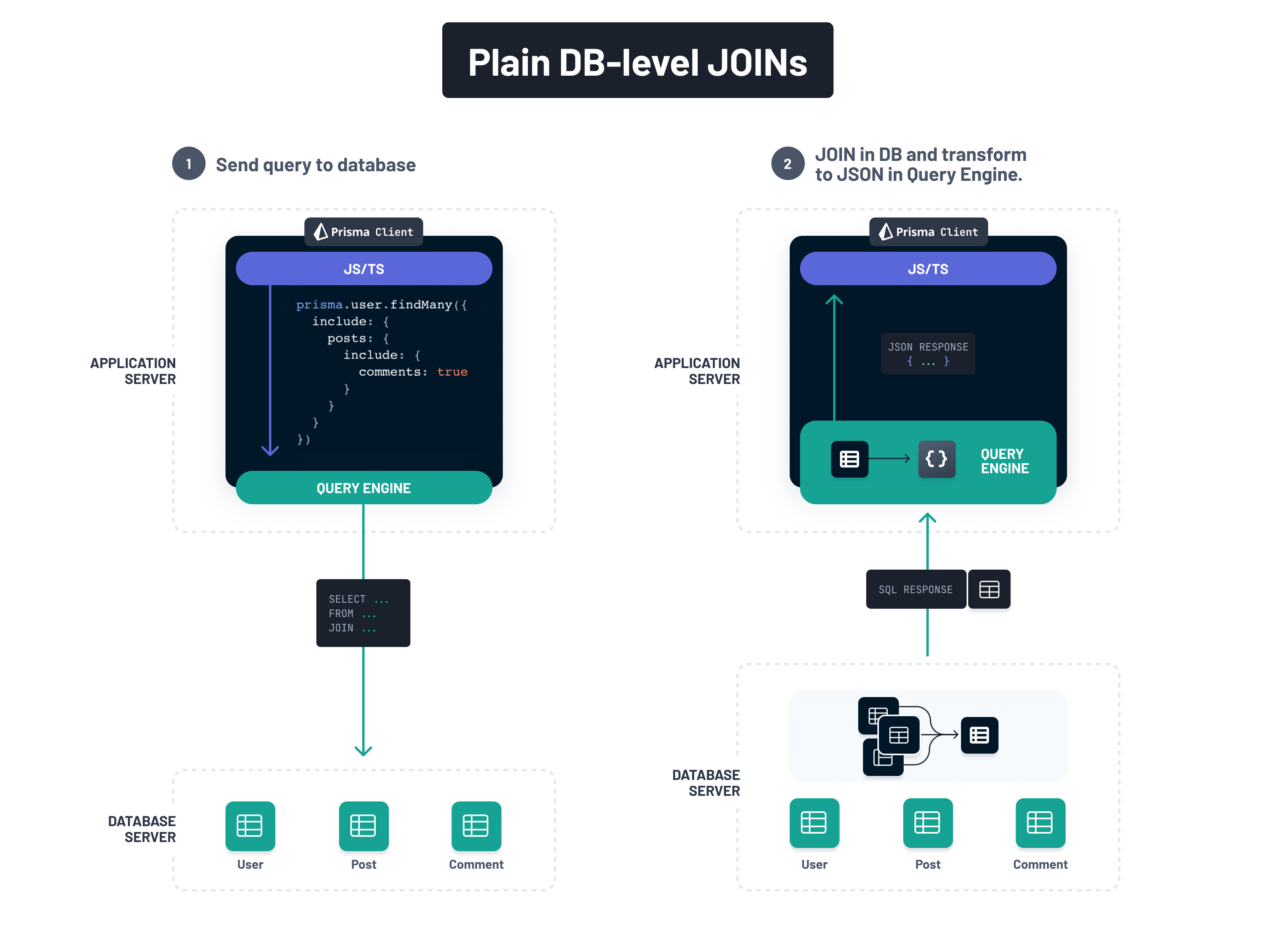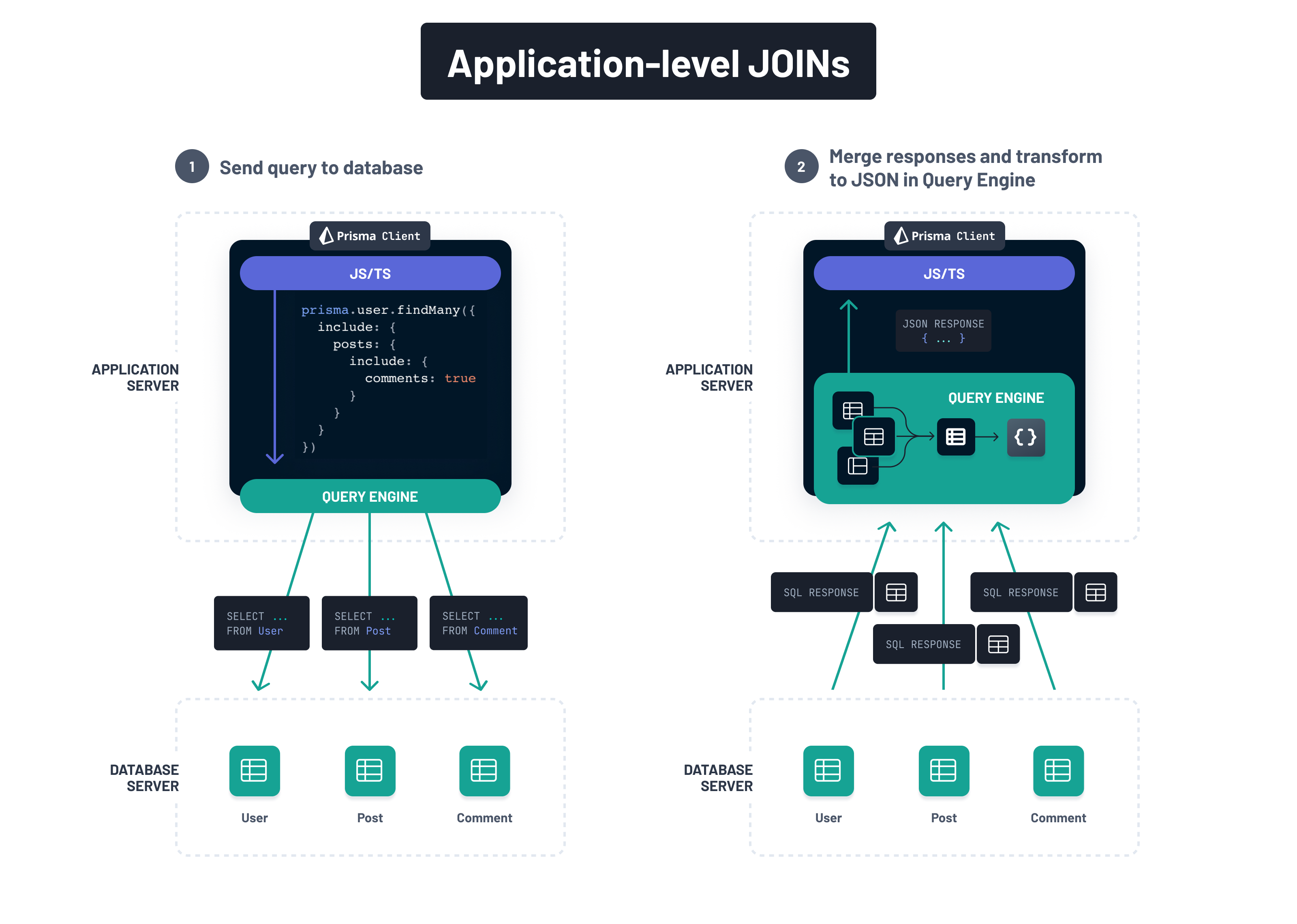 In the past, Prisma only supported the application-level join strategy which sends multiple queries to the database and does all the work of merging and transforming it into the expected JavaScript object structures inside of the query engine: