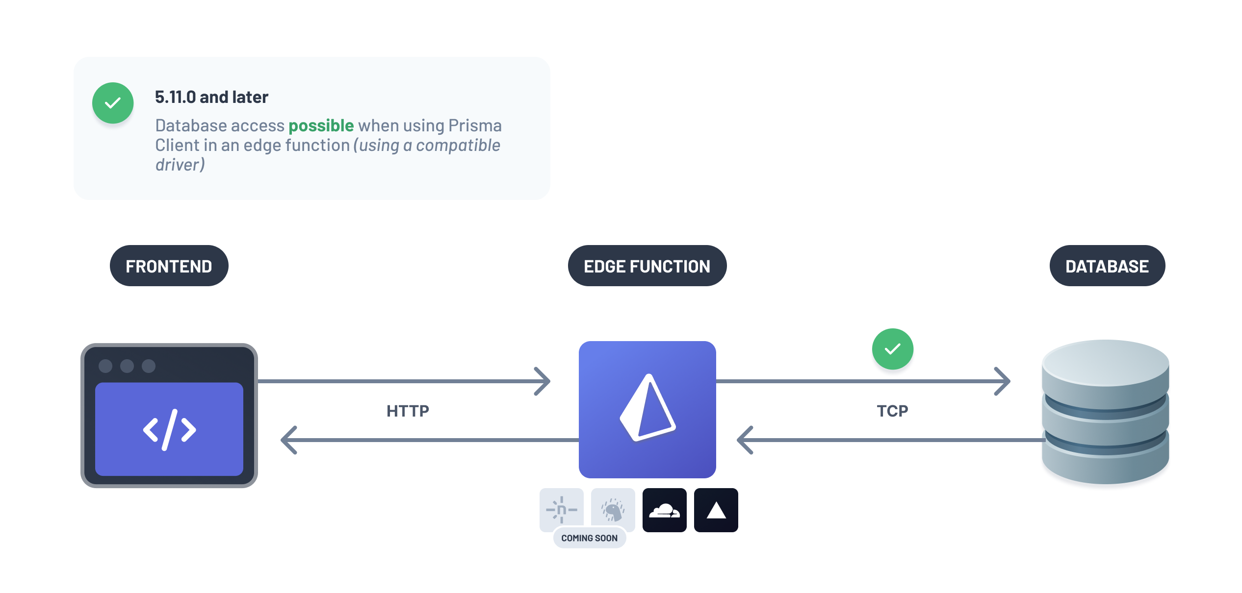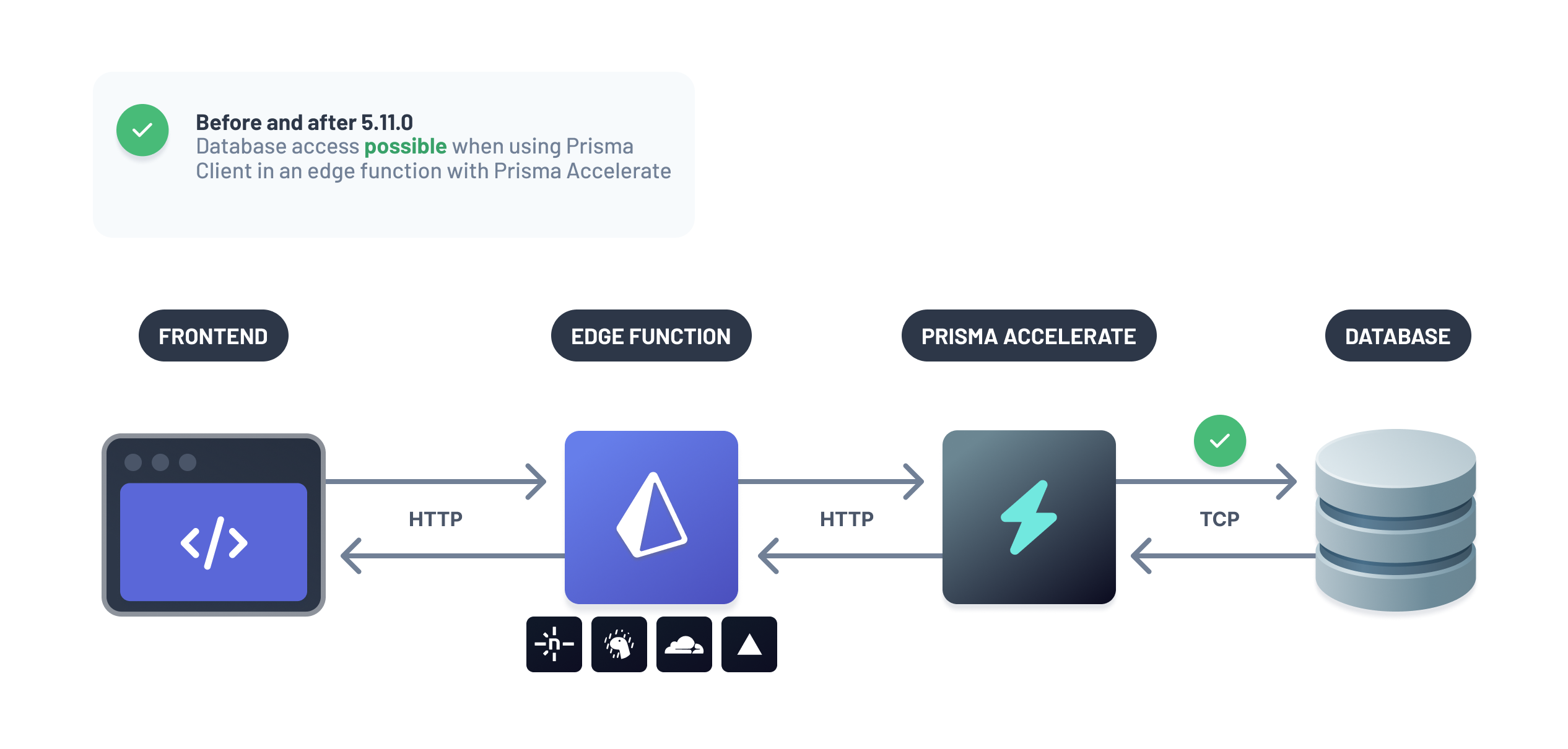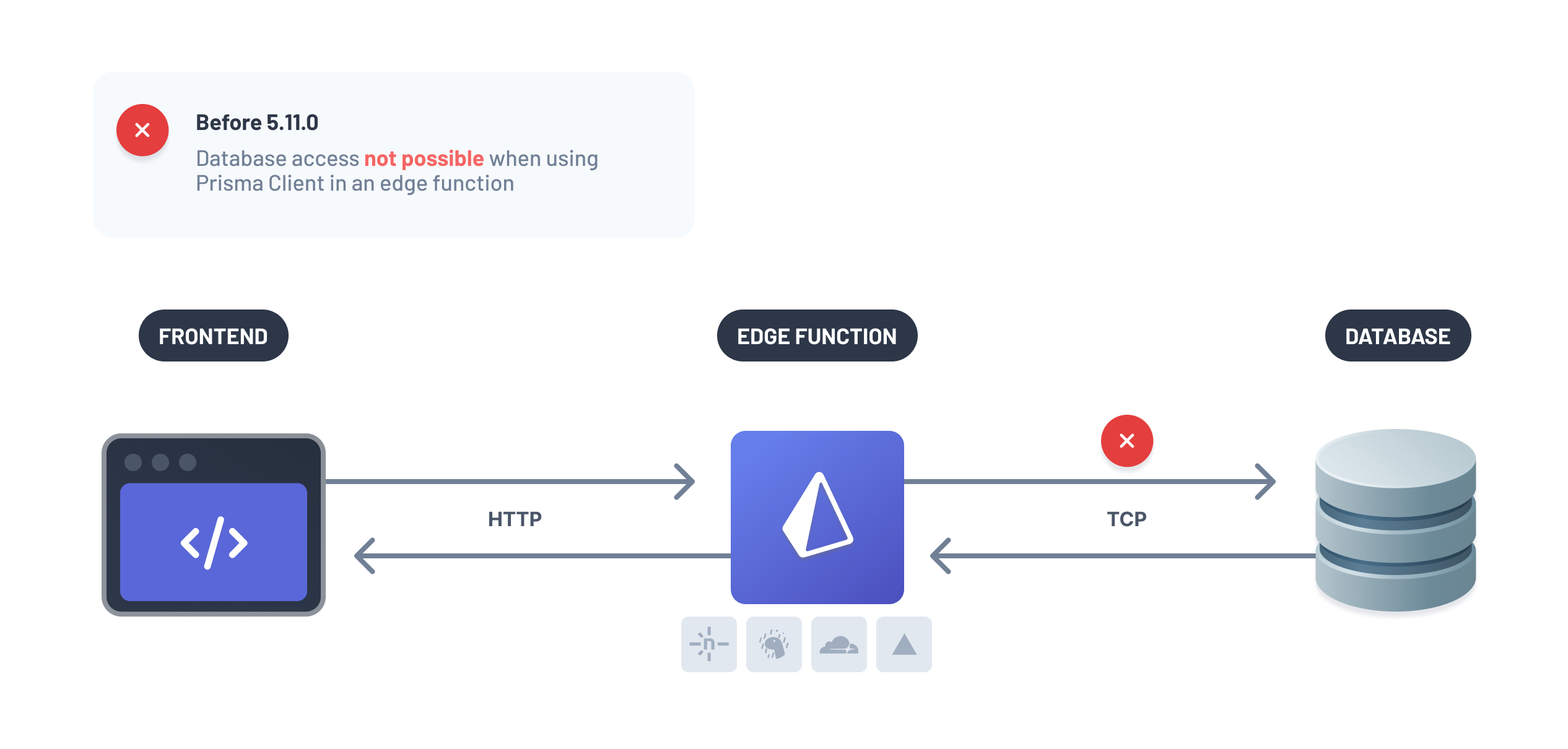 While it was possible to use Prisma ORM in an edge function in earlier versions, this always required usage of Prisma Accelerate as a proxy between the edge function and the database.