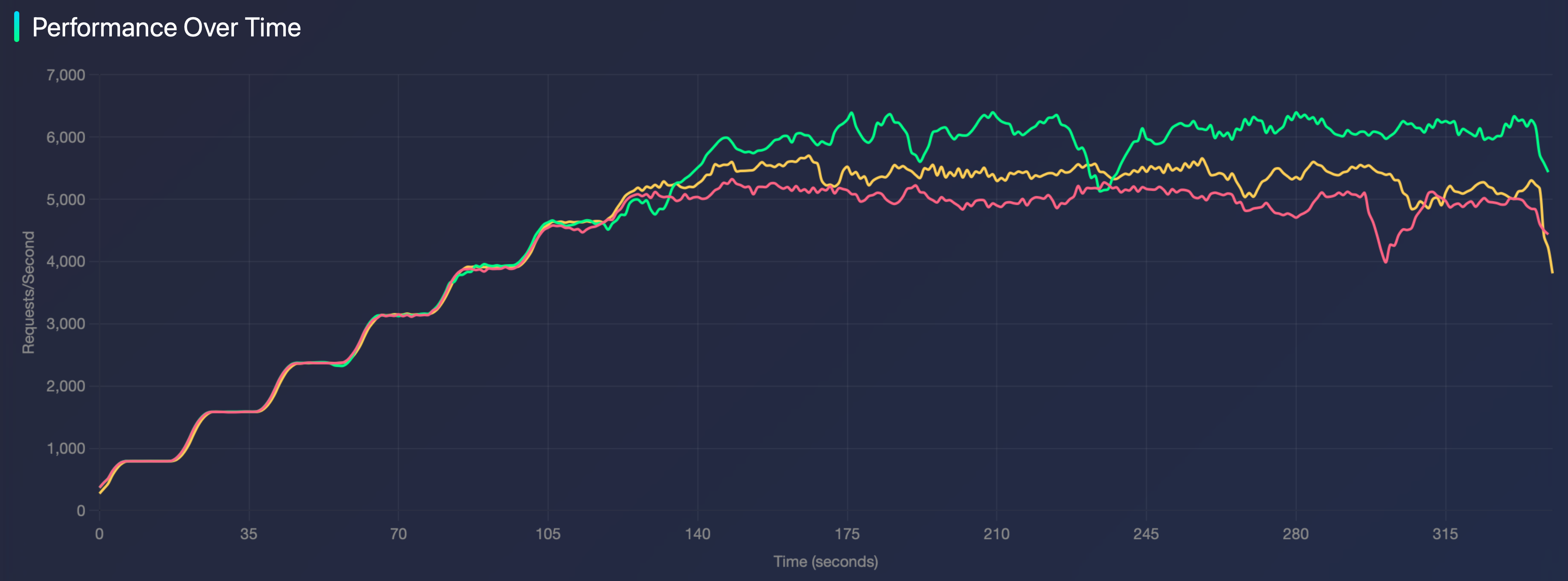 Here, we’re measuring requests per second. At the start, all three versions of Prisma ORM perform about the same. However, at a certain point, v6 and v7.3.0 begin to run into issues. v7.4.0, however, is able to handle more requests than both v6 and v7.3.0.