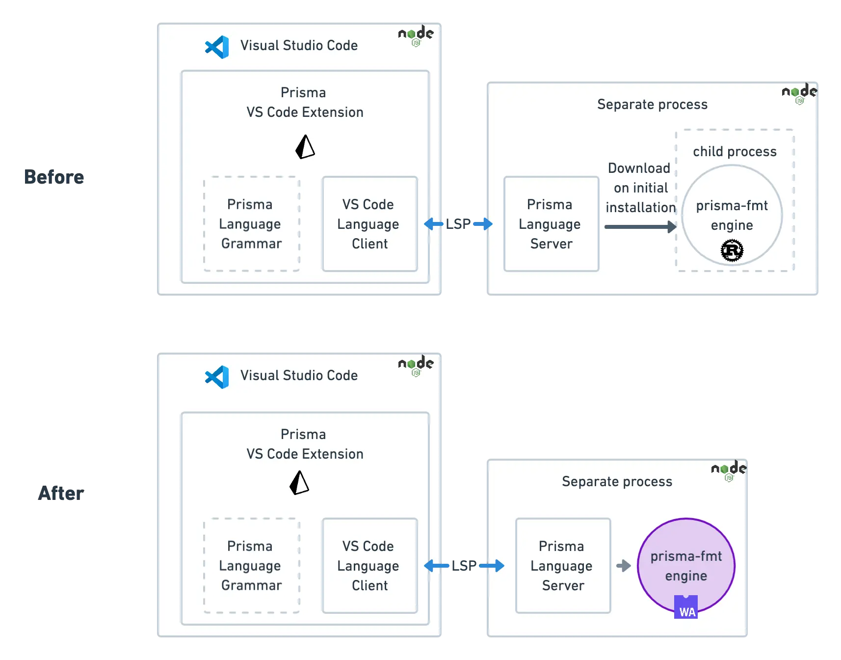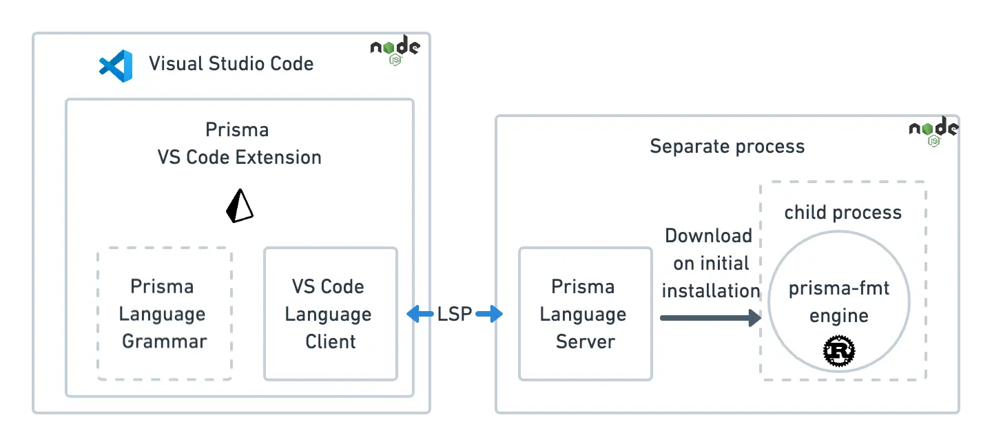 Because the runtime for VS Code extensions is Node.js, while the prisma-fmt engine is written in Rust, the Language Server code needs to start a side-car binary.