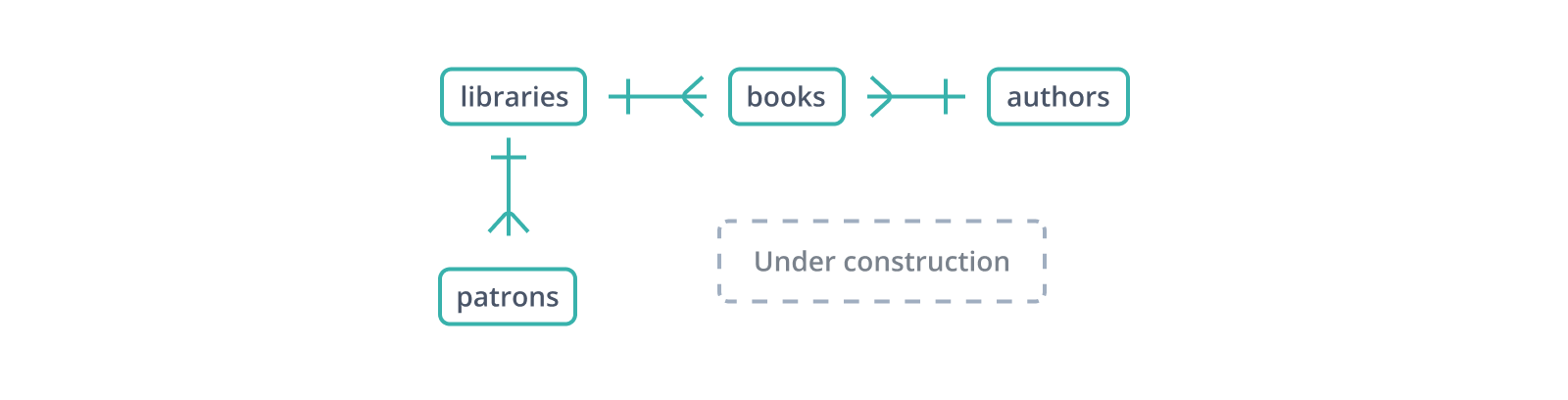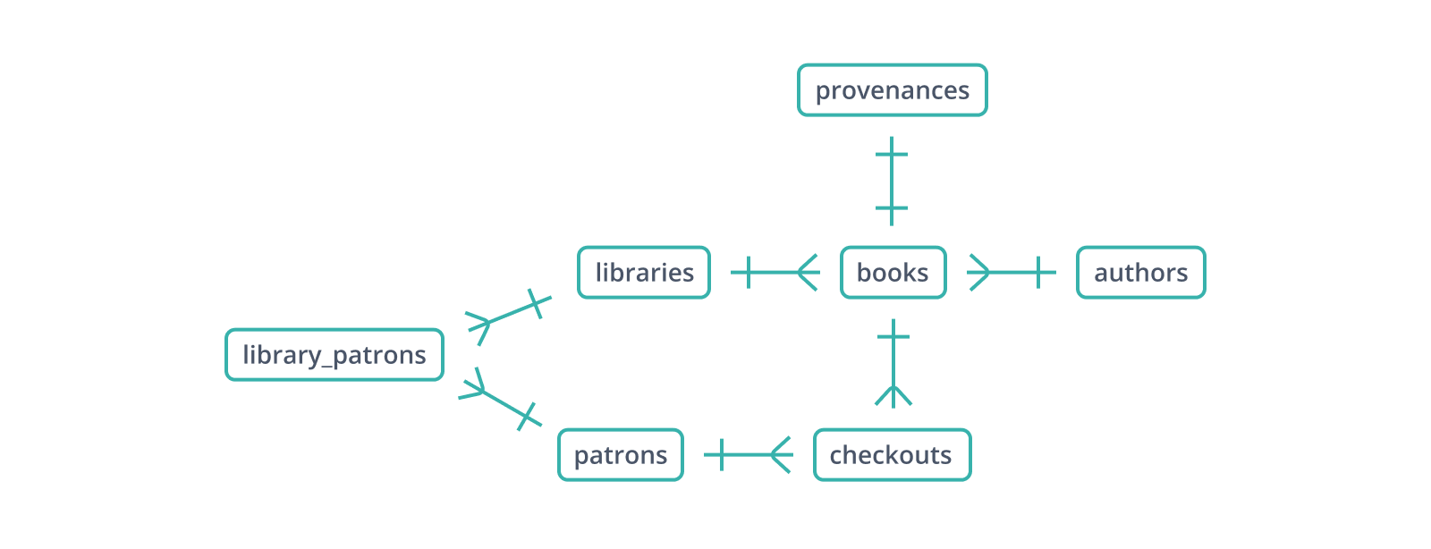checkouts, you might have noticed, doesn't follow the same naming convention as library_patrons -- it's not patron_books or vice versa. That's because it's more than a junction table. Like library_patrons, checkouts maintains foreign keys to the tables it connects in a many-to-many relationship, but it must also include information about each patron-book connection: the date checked out, the date due or returned, whether an extension has been granted. It's also perfectly possible for someone to check out the same book multiple times, so (patron_id, book_id) is not a viable primary key.