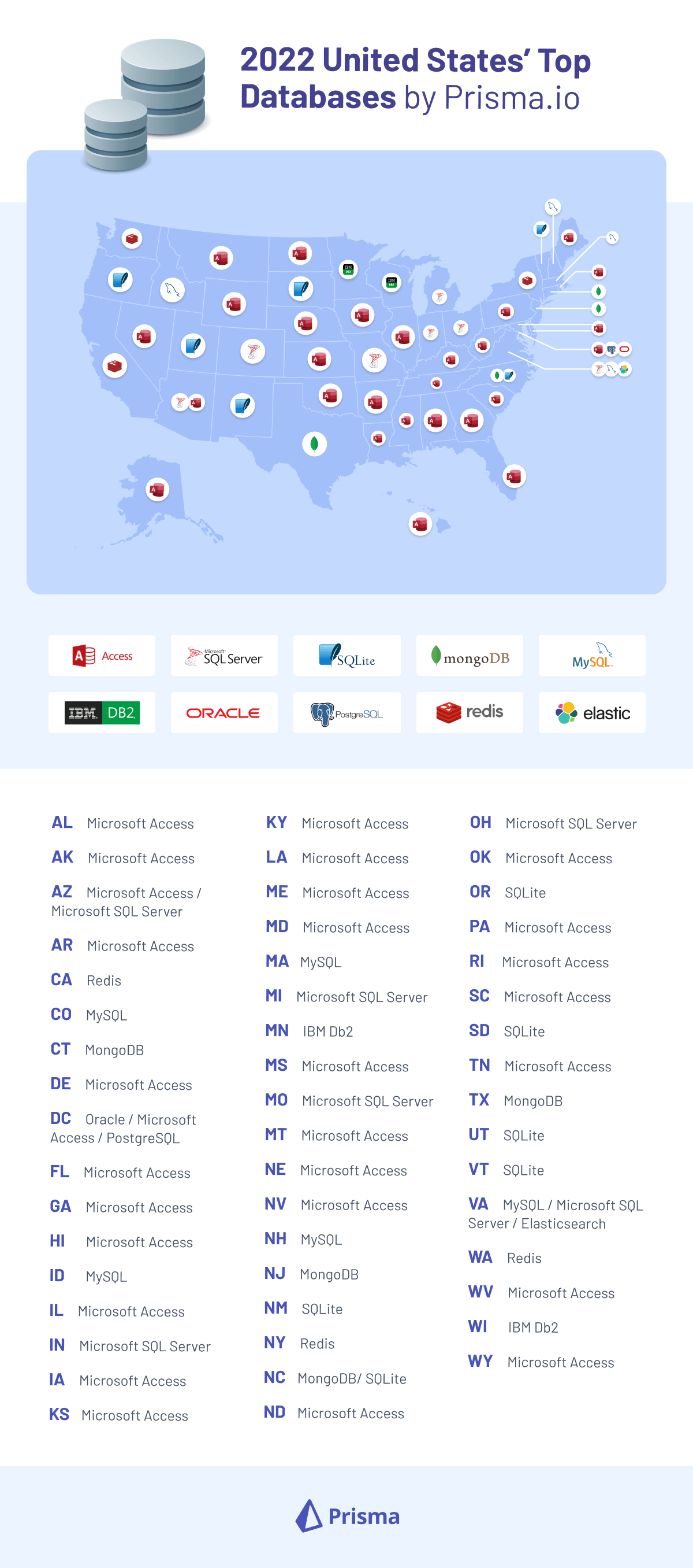 As a next-generation open-source ORM designed to abstract away the functions of traditional management systems to improve developer productivity, we at Prisma were curious to learn which databases are most predominant throughout the United States. So, we performed a bit of research on our own. Check out the map to see what database is each state’s favorite going into 2022 - the results may surprise you!