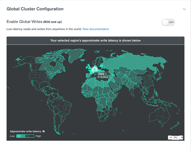 The first section after selecting a Dedicated cluster instance is Global Cluster Configuration. It displays a map that shows the approximate write latency of every region from high to low. Atlas Global Clusters are for sharded cluster zones to support location-aware read and write operations for globally distributed applications.