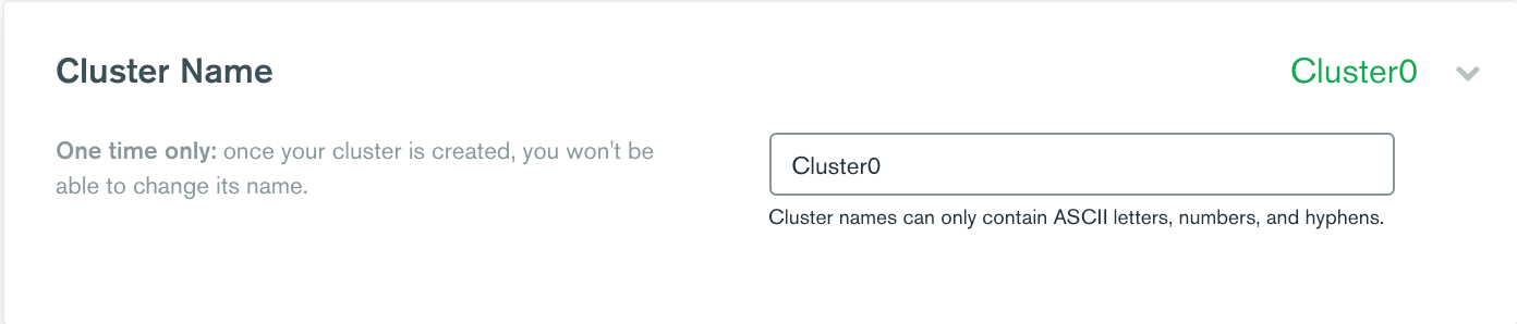 It is important to make note that a cluster cannot be renamed. Additionally, cluster names can only contain ASCII letters, numbers, and hyphens. You can now click on the Create Cluster button, wait for your replica set to spin up, and get to work with your new MongoDB instance.