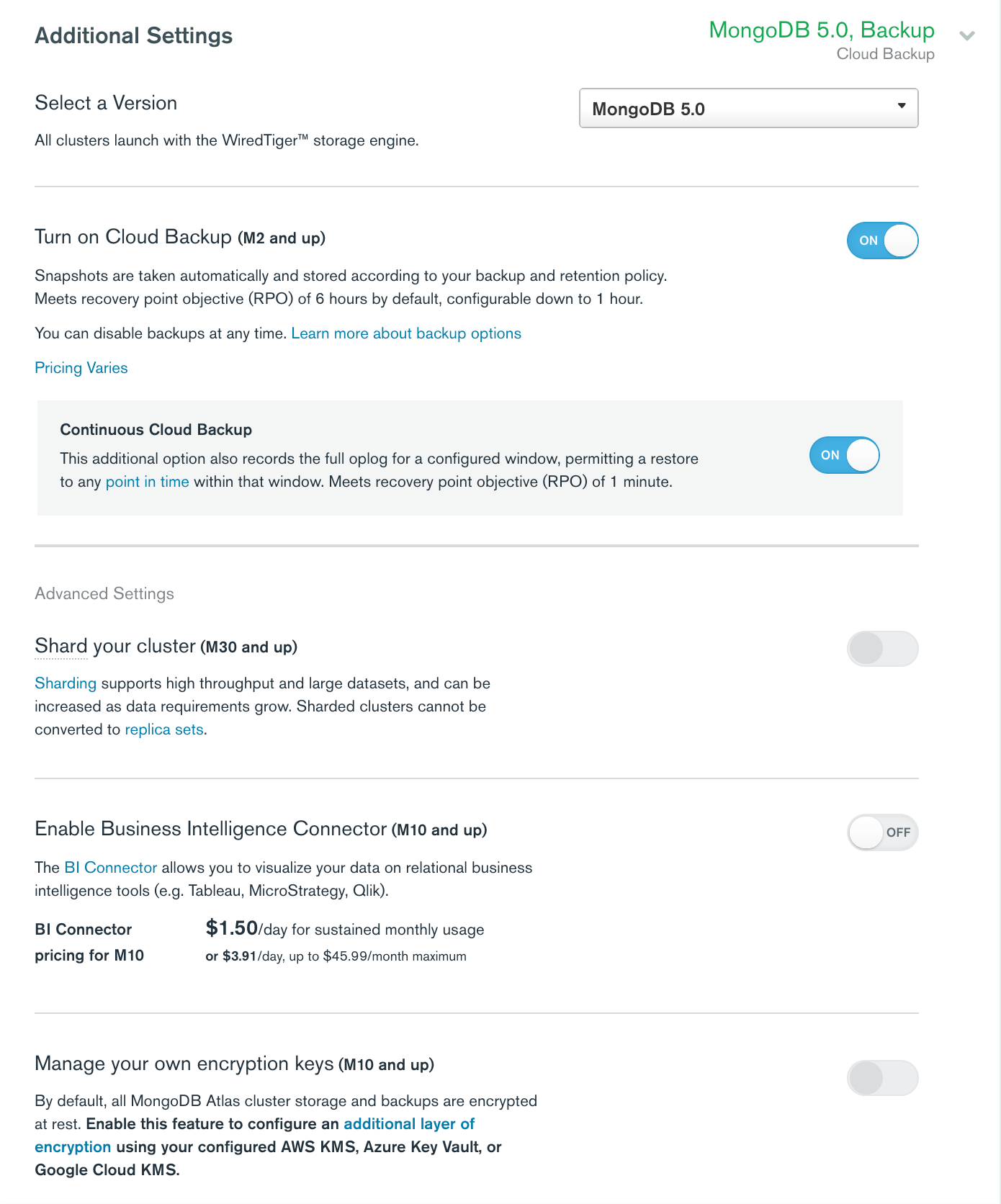 Now that you have your cluster tier picked out, there are some additional settings to consider.