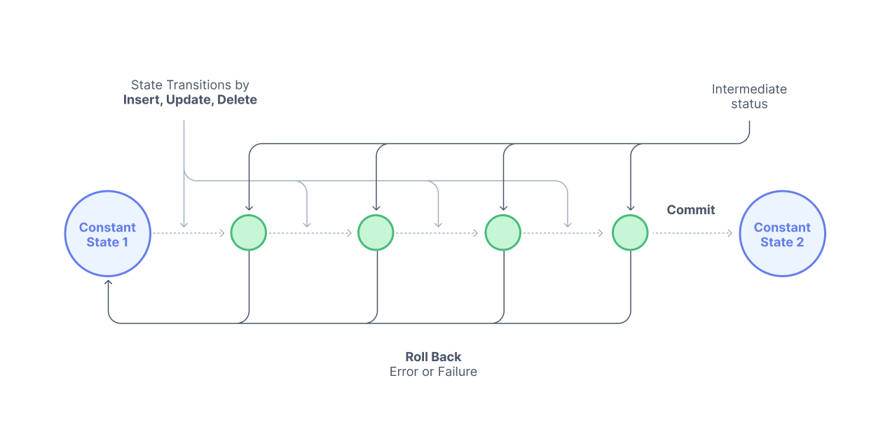 This difference demonstrates that the transaction is still currently in a state of ambiguity. It can still either succeed and be committed to the database or it could fail and be aborted. Either way, the database will end up in a consistent state. It will include the new record or incur a rollback to the same state as before the transaction session started.