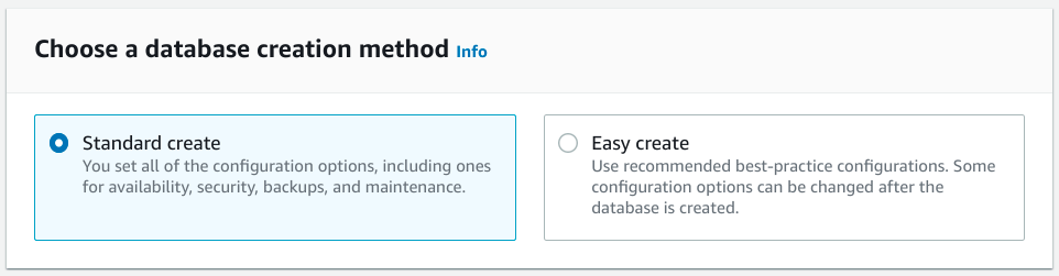 The first step in provisioning a new database on RDS is to choose the creation method: