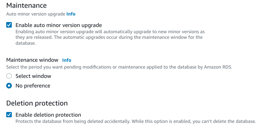 It is always a good idea to enable deletion protection for your production database. This prevents you from accidentally deleting your database instance by requiring you to revert this option before a deletion will be successfully processed. There is no reasonable reason to opt out of this option for most use cases.