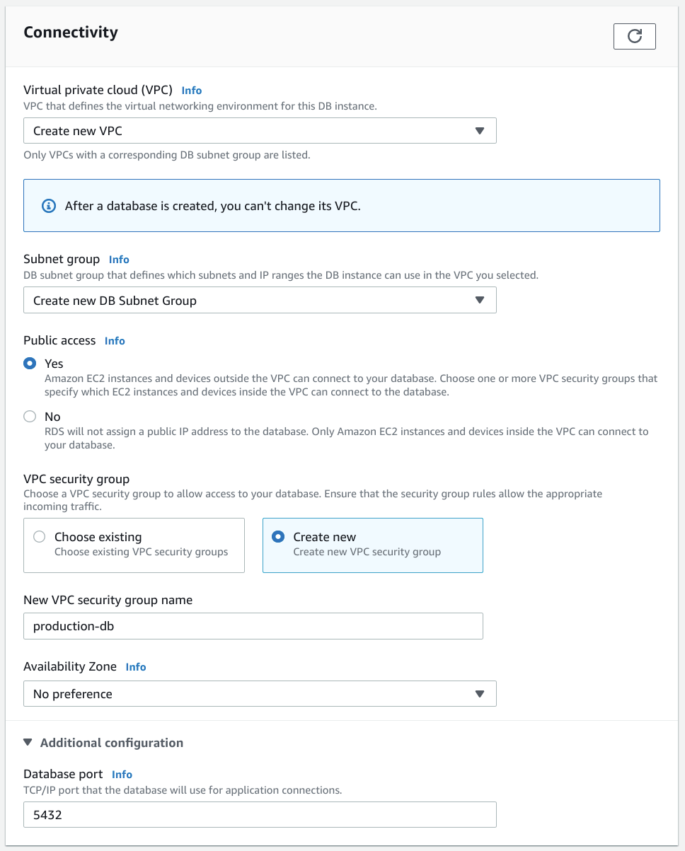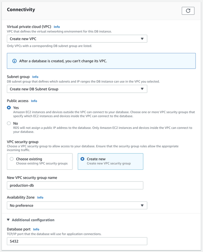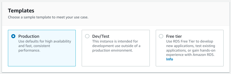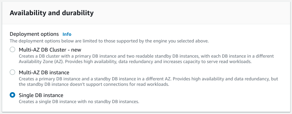 This section determines exactly how your database will be deployed within AWS's environment. This has implications on how resistant your setup is to failure and outages, both of your specific instance and of regional disruptions in Amazon's infrastructure.