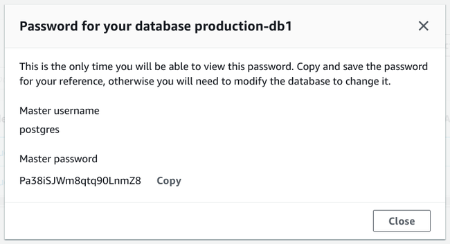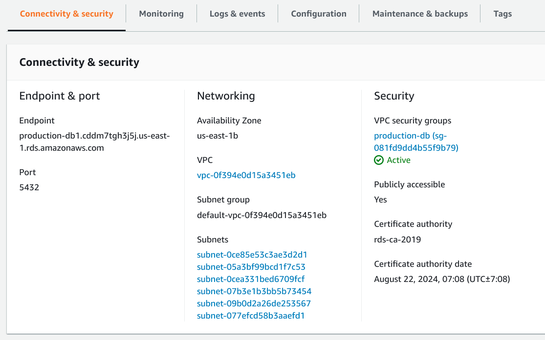 In this example, our endpoint name (URL for the host) is production-db1.cddm7tgh3j5j.us-east-1.rds.amazonaws.com and our database is listening on PostgreSQL's standard port: 5432.