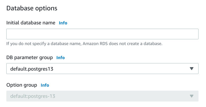 If you'd like, you can choose to have RDS automatically create an initial database for your deployment. This is usually unnecessary as any migrations you run or other setup scripts you might have typically create the necessary database structures within the instance.