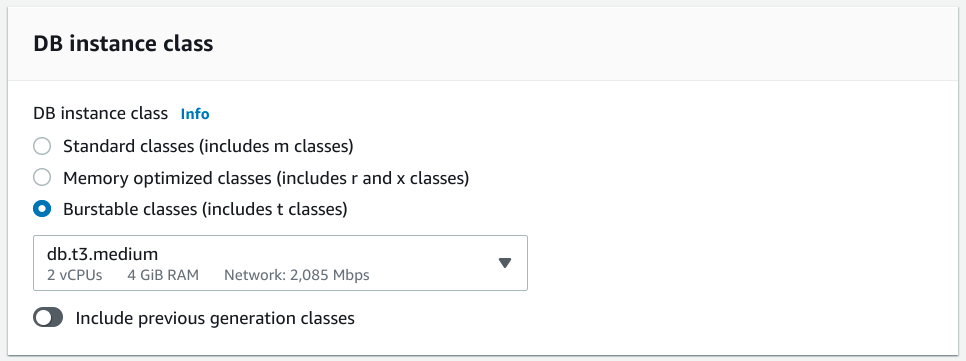 Specifically, instances like the db.t3.medium, which provides 2 vCPUs and 4 GiB RAM, is a good baseline selection for many use cases if you are just starting out. The CPU should be able to handle a medium level of activity while accommodating request spikes. Assuming the hardware performance is suitable for your project, one of the first limitations you might run into is the network cap of 2,086 Mbps, so keep that in mind as you decide.
