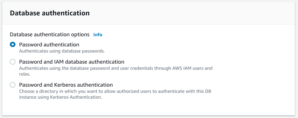 In general, it is reasonable to just use password authentication unless you have a need for more complex configuration. The IAM database option may be attractive if you are heavily invested in the AWS ecosystem and IAM-based authentication for many other parts of your infrastructure. It is not worth choosing the Kerberos option unless you are already using that service for other purposes.