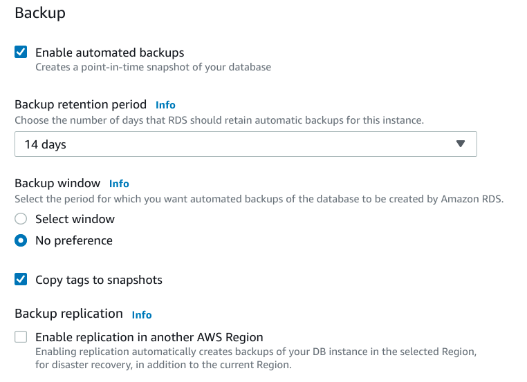 If you want additional protection, you can also select Backup replication to replicate your changes to a different AWS region automatically as well. This will allow you to quickly restore from a different region, but will increase your S3 storage costs and data transfer costs.