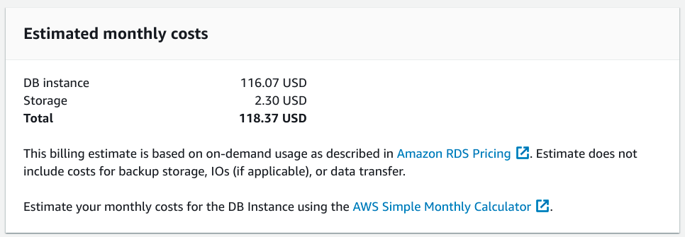 We've finally reached the end of the configuration process. At the bottom of the page, you can see an estimate for the monthly cost of your configured database instance: