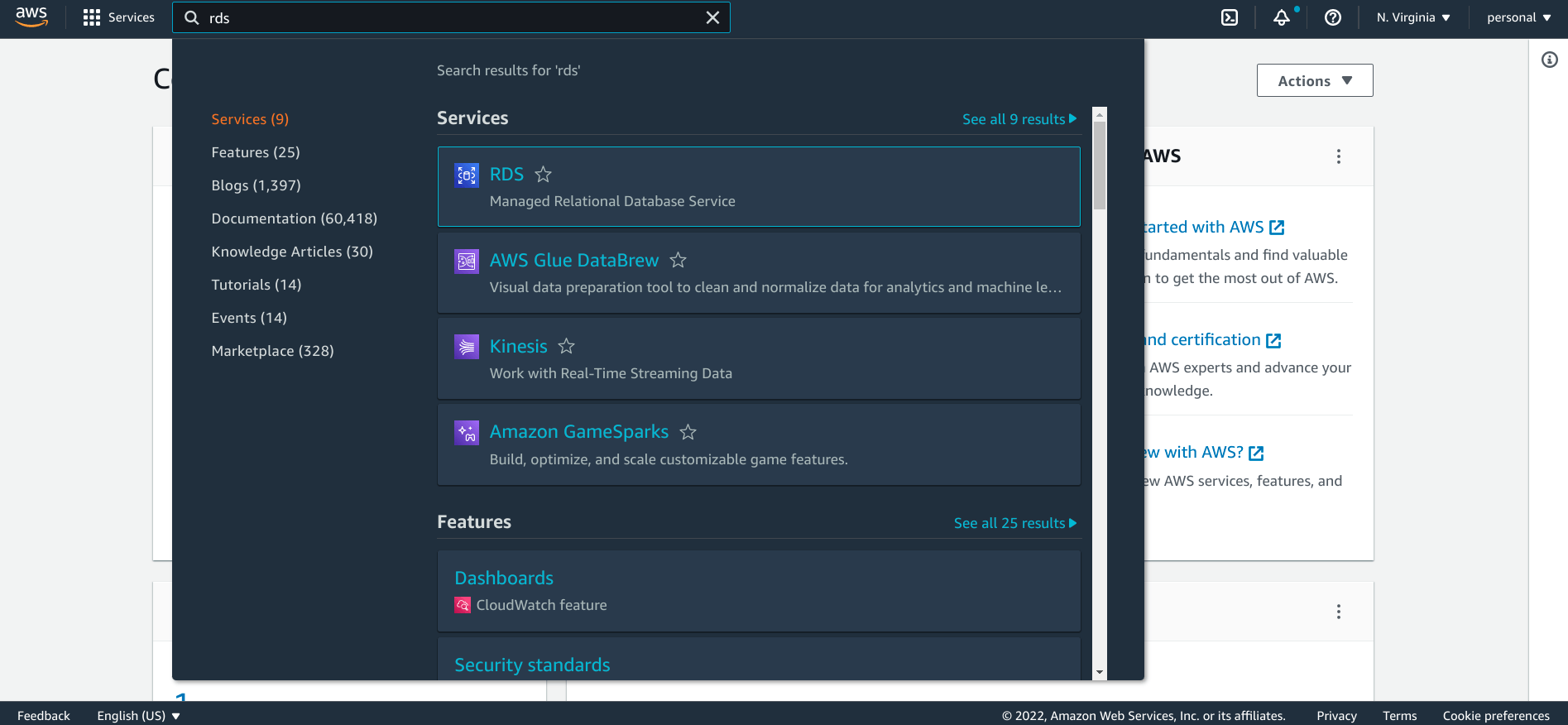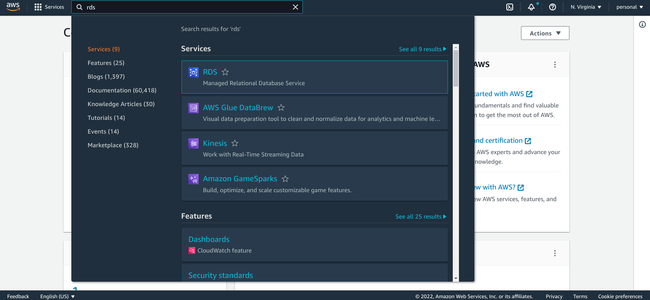 From the AWS console home, type rds in the service search bar to locate the RDS service: