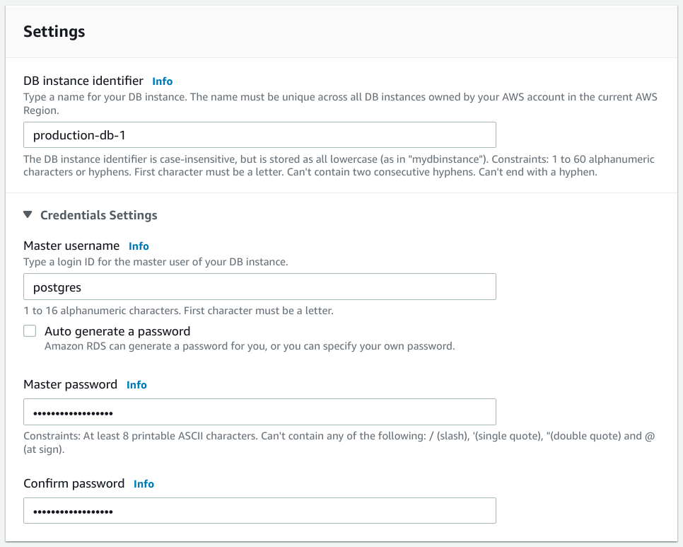 Next, configure the credentials for your database instance. Start by setting the master username for your PostgreSQL database. By default, most PostgreSQL client tools assume that the master user is called postgres, so you can keep that username if appropriate.