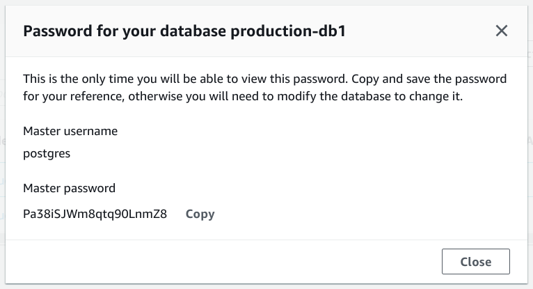 Note: The master username is the main administrative account within the PostgreSQL database instance. You should always create and configure additional application-specific usernames with limited privileges after provisioning your database instance. Configure your database clients and applications to use those less privileged identities for their daily operations. Only use the master username for your initial configuration and to create more limited and narrowly scoped avenues of access.