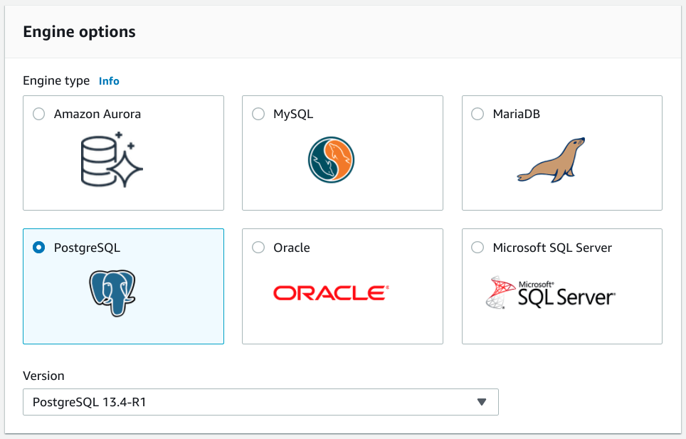For this guide, we will be configuring a PostgreSQL database, so we will choose the PostgreSQL option. Amazon's Aurora is an alternative PostgreSQL-compatible option that provides Amazon's own scaling and management features. For this guide, however, we will focus on a PostgreSQL native deployment.