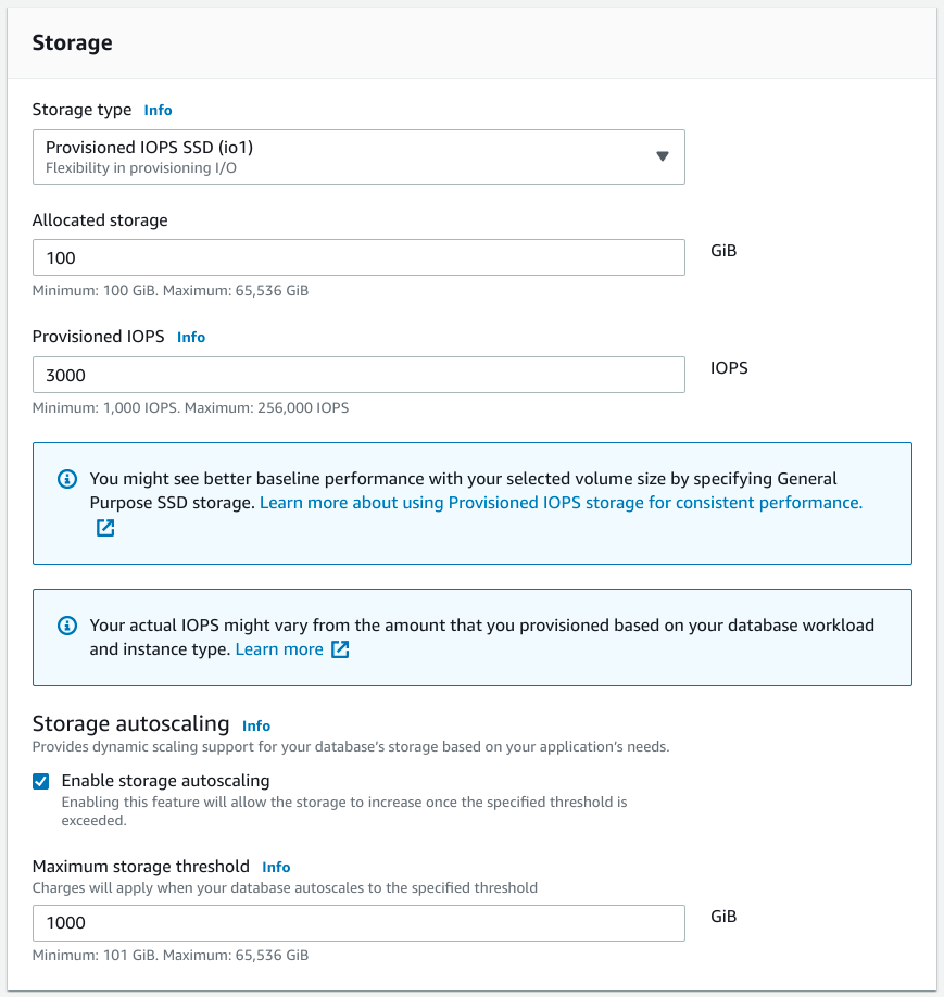 - Provisioned IOPS SSD (io1): This option allows you to decouple the amount of storage space from the IOPS allocated to your database.