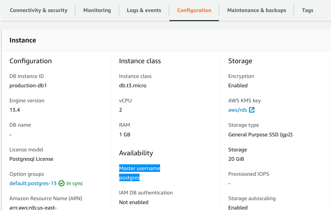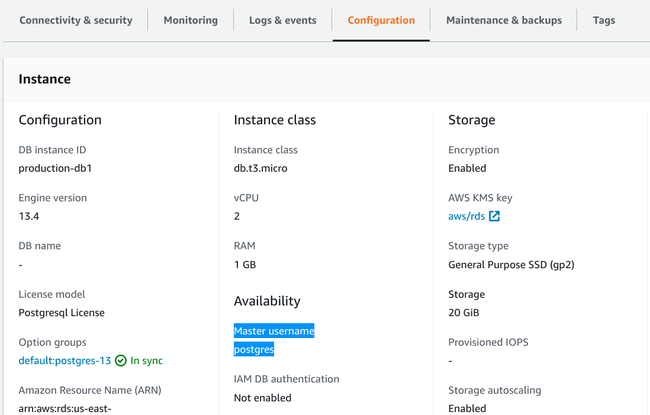 To find the master username that you configured (this will be postgres if you didn't modify it), visit the Configuration tab and look for the Master username field under the Availability heading: